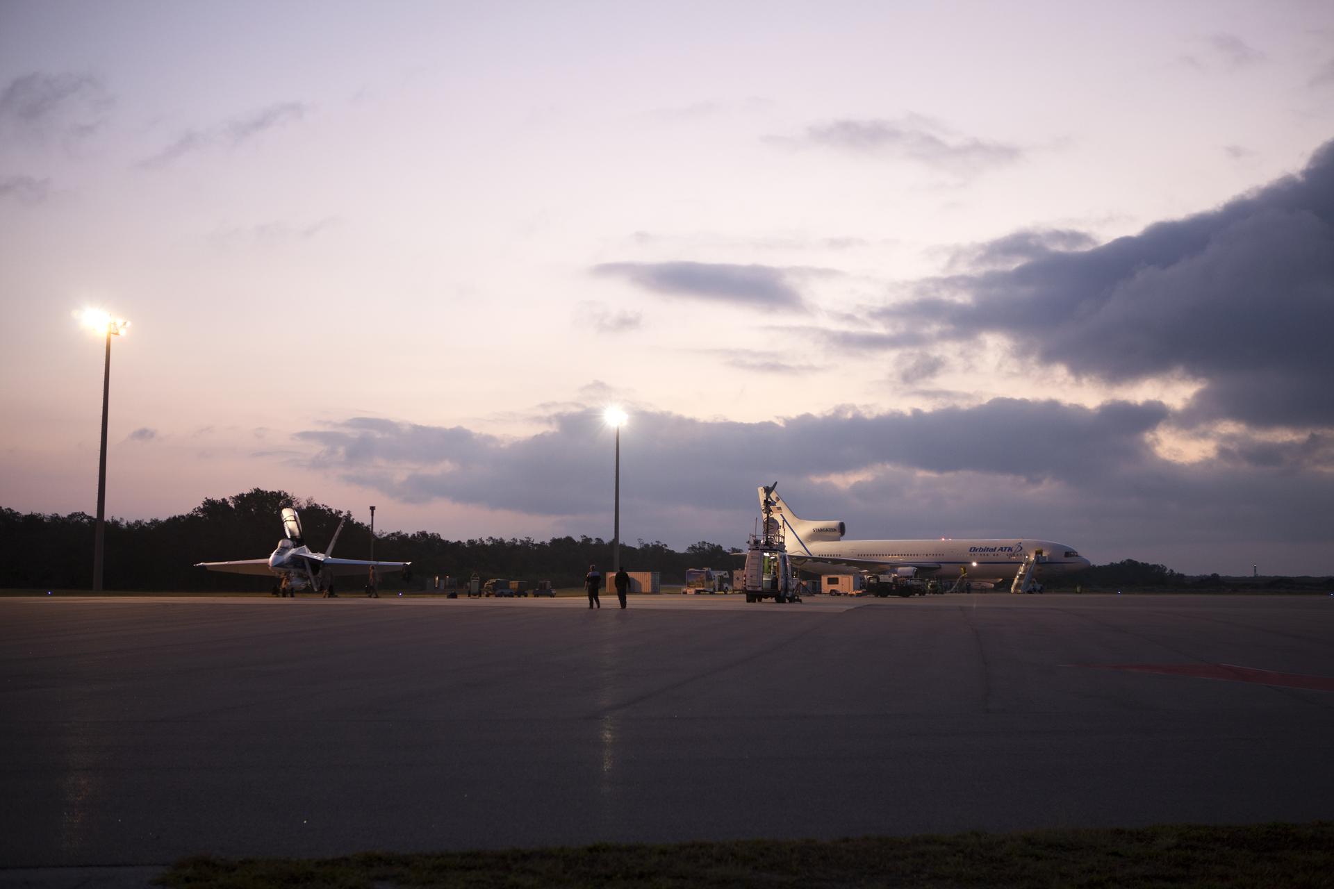 A pathfinder aircraft, at left, prepares for takeoff from the Skid Strip at Cape Canaveral Air Force Station in Florida. The airplane will provide photographic and video imagery of the Orbital ATK L-1011 Stargazer aircraft, in view at right, carrying a Pegasus XL Rocket with eight NASA Cyclone Global Navigation Satellite System, or CYGNSS, spacecraft. With the aircraft flying off shore, the Pegasus rocket will be released. Five seconds later, the solid propellant engine will ignite and boost the eight hurricane observatories to orbit. The eight CYGNSS satellites will make frequent and accurate measurements of ocean surface winds throughout the life cycle of tropical storms and hurricanes.