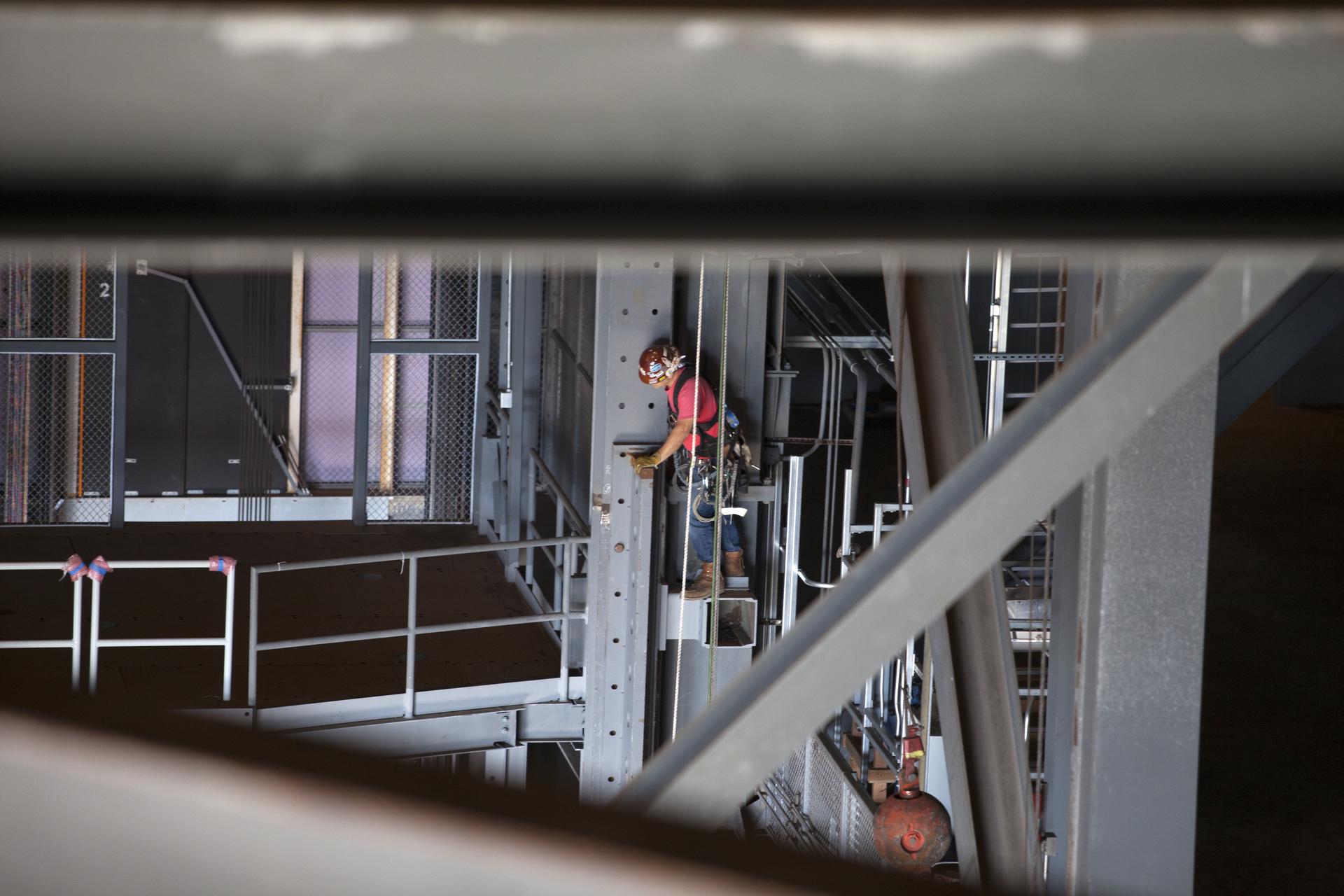 A construction worker wearing a safety harness and tethered lines monitors the progress during the installation of the second half of the B-level work platforms, B north, for NASA’s Space Launch System (SLS) rocket, high up in the Vehicle Assembly Building (VAB) at NASA’s Kennedy Space Center in Florida. The B platform will be installed on the north side of High Bay 3. The B platforms are the ninth of 10 levels of work platforms that will surround and provide access to the SLS rocket and Orion spacecraft for Exploration Mission 1. The Ground Systems Development and Operations Program is overseeing upgrades and modifications to VAB High Bay 3, including installation of the new work platforms, to prepare for NASA’s Journey to Mars.