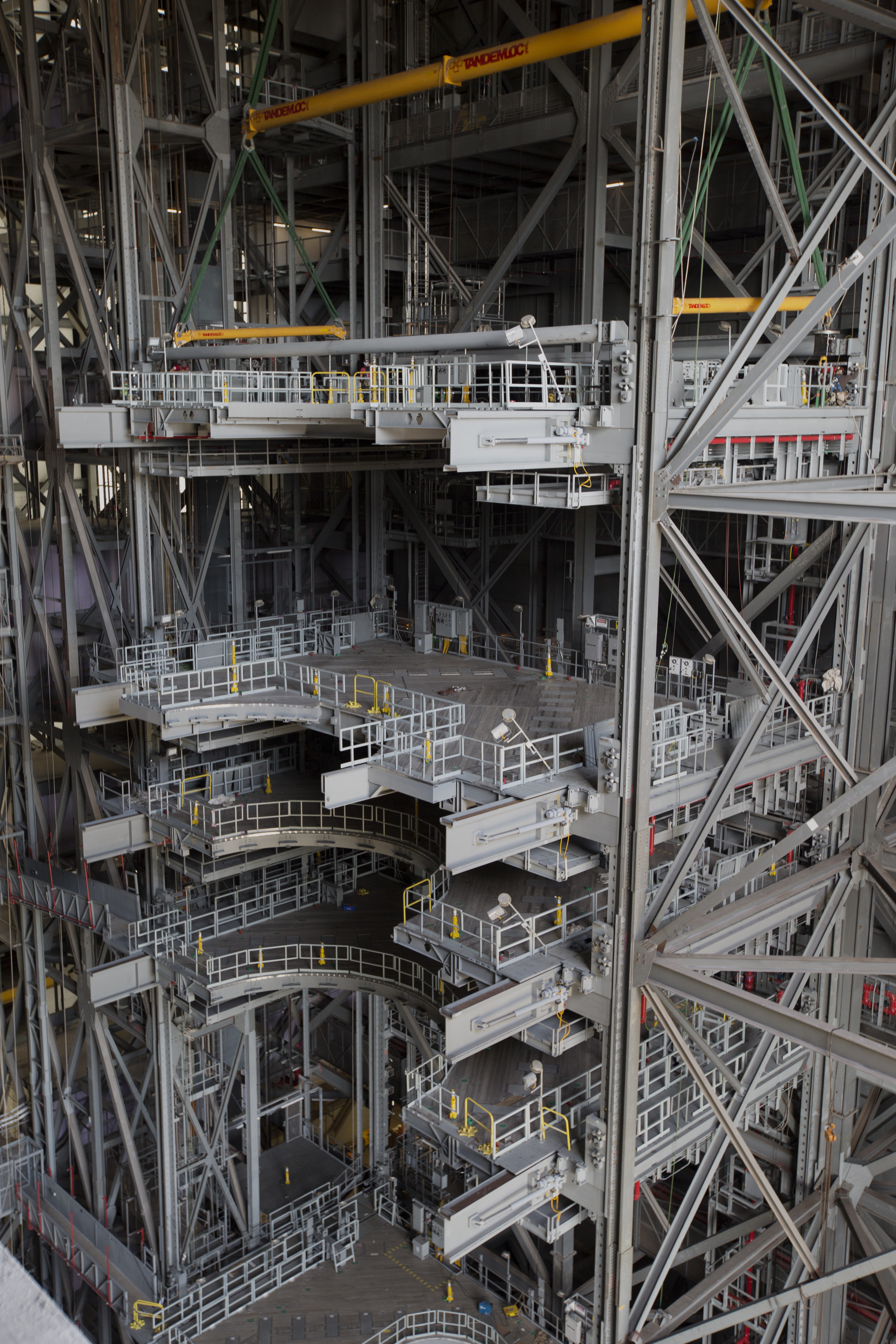 High up in the Vehicle Assembly Building (VAB) at NASA's Kennedy Space Center in Florida, the second half of the B-level work platforms, B north, for NASA's Space Launch System (SLS) rocket, has been lowered into place for installation on the north wall of High Bay 3. In view below are several levels of previously installed platforms. The B platforms are the ninth of 10 levels of work platforms that will surround and provide access to the SLS rocket and Orion spacecraft for Exploration Mission 1. The Ground Systems Development and Operations Program is overseeing upgrades and modifications to VAB High Bay 3, including installation of the new work platforms, to prepare for NASA’s Journey to Mars.