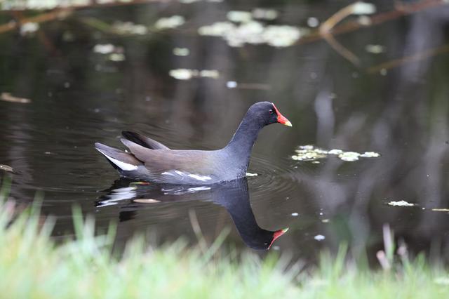 A common gallinule swims in a waterway at NASA's Kennedy Space Center in Florida. The center shares a border with the Merritt Island National Wildlife Refuge. More than 330 native and migratory bird species, 25 mammals, 117 fishes and 65 amphibians and reptiles call Kennedy and the wildlife refuge home.