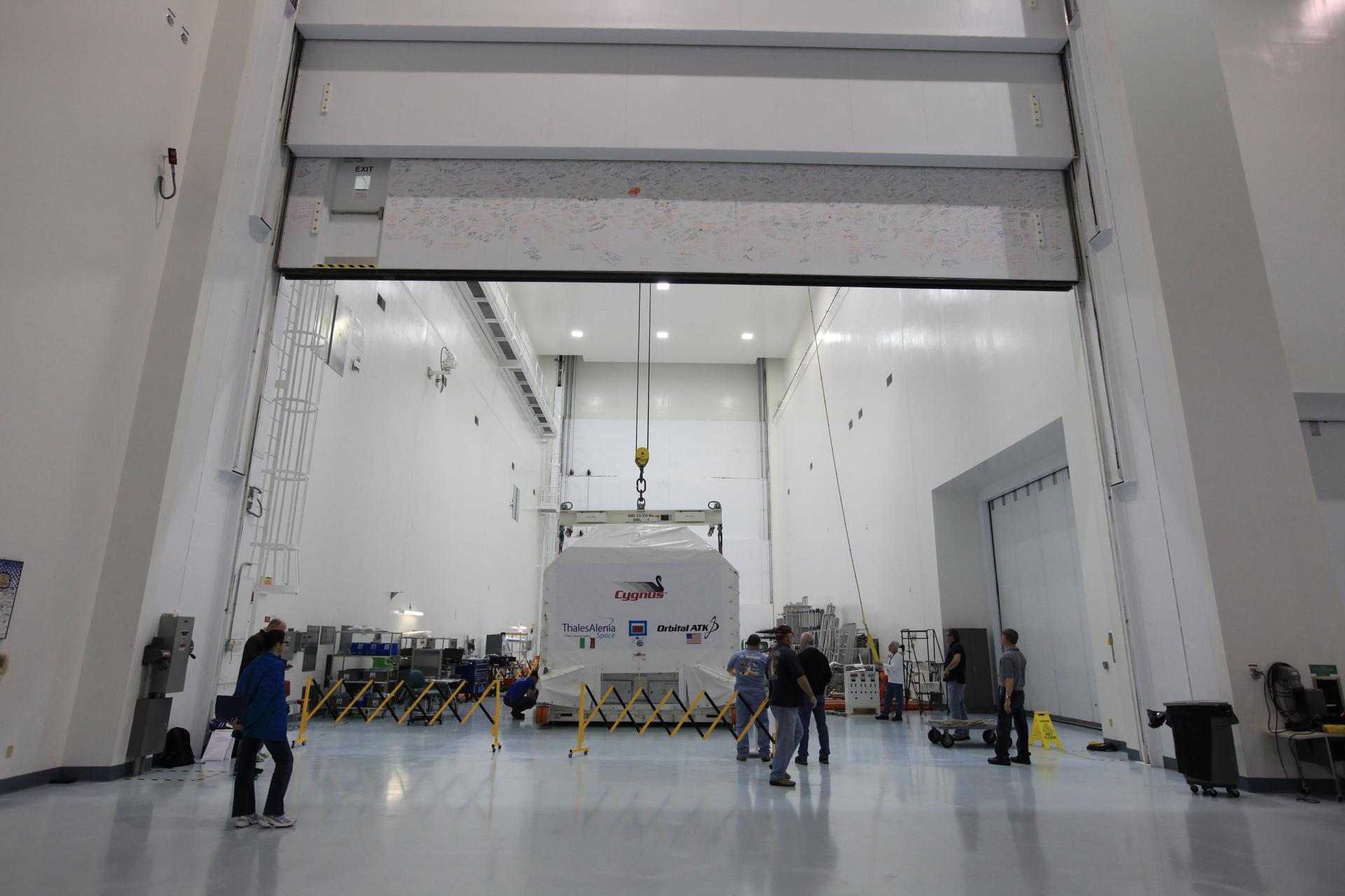 Inside an environmentally controlled shipping container the Orbital ATK OA-7 Cygnus spacecraft's pressurized cargo module (PCM) moves from an airlock to the high bay of the Space Station Processing Facility of NASA's Kennedy Space Center in Florida. Scheduled to launch on March 19, 2017, the Orbital ATK OA-7 mission will lift off atop a United Launch Alliance Atlas V rocket from Space launch Complex 41 at Cape Canaveral Air Force Station. The commercial resupply services mission to the International Space Station will deliver thousands of pounds of supplies, equipment and scientific research materials that improve life on Earth and drive progress toward future space exploration.
