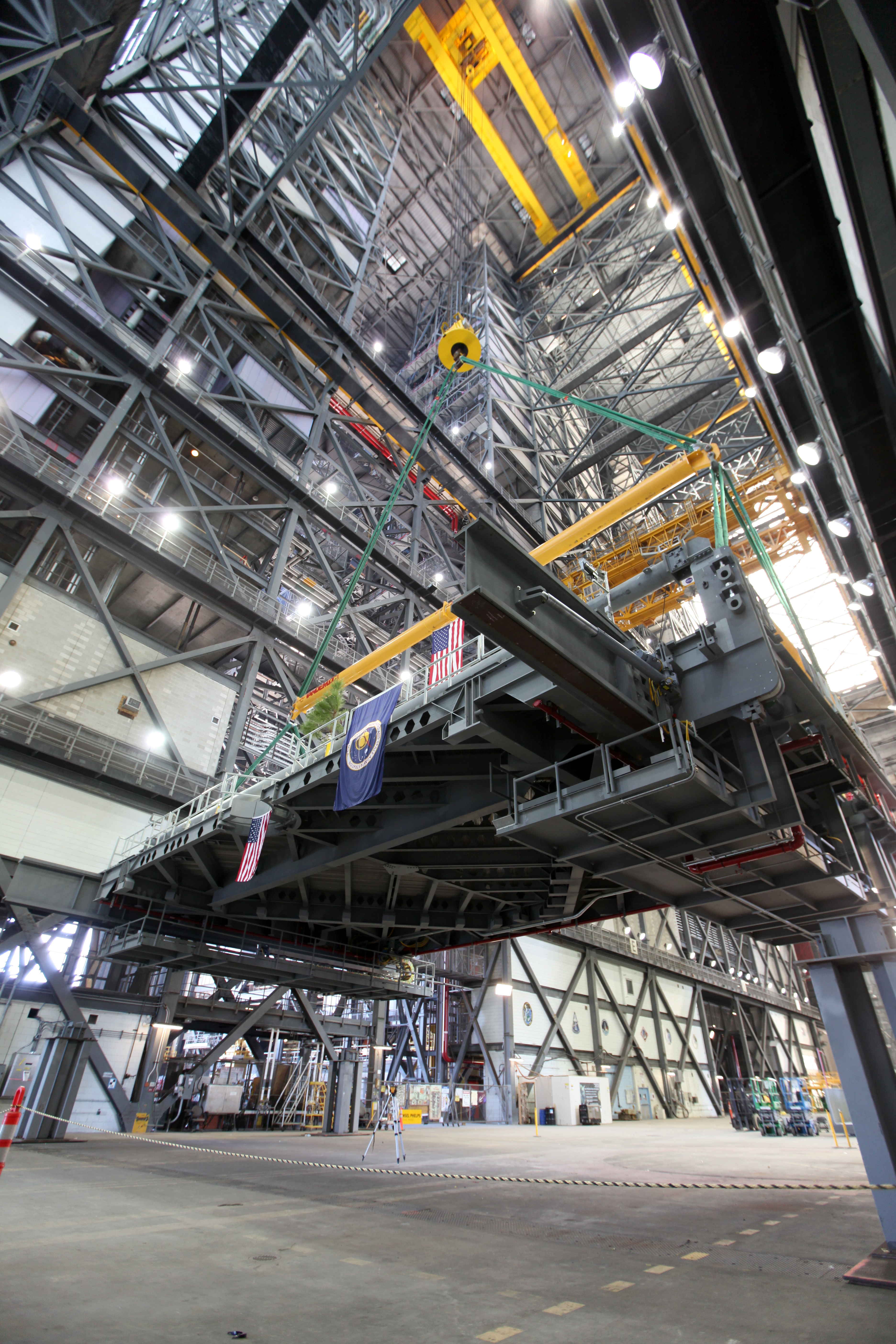 A crane begins to lift the final work platform, A north, in the transfer aisle of the Vehicle Assembly Building (VAB) at NASA's Kennedy Space Center in Florida. The platform will be installed and secured on its rail beam high up on the north wall of High Bay 3. The installation of the final topmost level completes the 10 levels of work platforms, 20 platform halves altogether, that will surround NASA's Space Launch System rocket and the Orion spacecraft and allow access during processing for missions, including the first uncrewed flight test of Orion atop the SLS rocket in 2018. The A-level platforms will provide access to the Orion spacecraft's Launch Abort System for Orion lifting sling removal and installation of the closeout panels. The Ground Systems Development and Operations Program, with support from the center's Engineering Directorate, is overseeing upgrades and modifications to the VAB, including installation of the new work platforms.