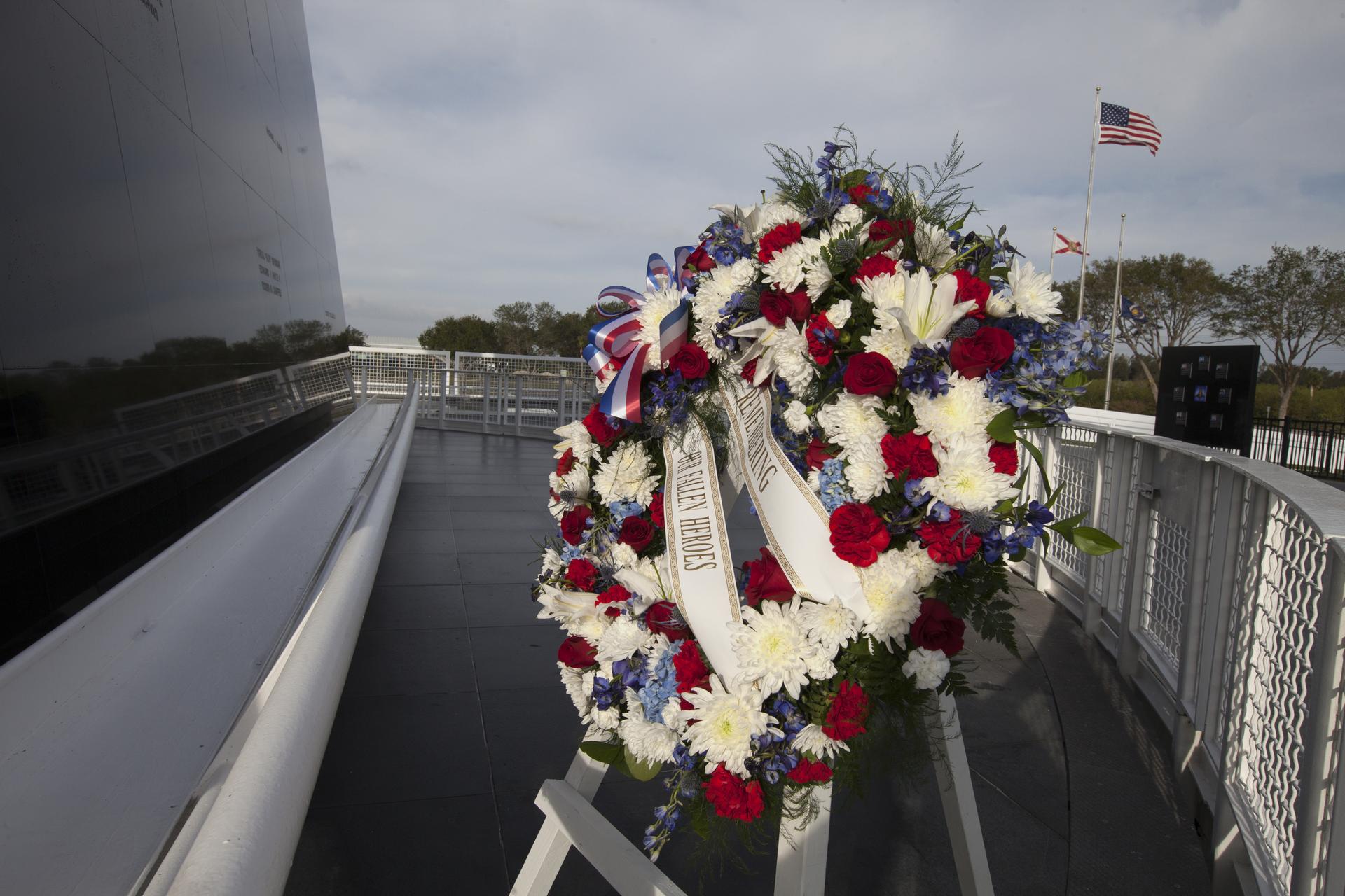 A wreath is placed near the Space Mirror Memorial at the Kennedy Space Center Visitor Complex in preparation for Kennedy Space Center's Day of Remembrance ceremony. The annual event honors the contributions of all astronauts who lost their lives in the quest for space exploration.