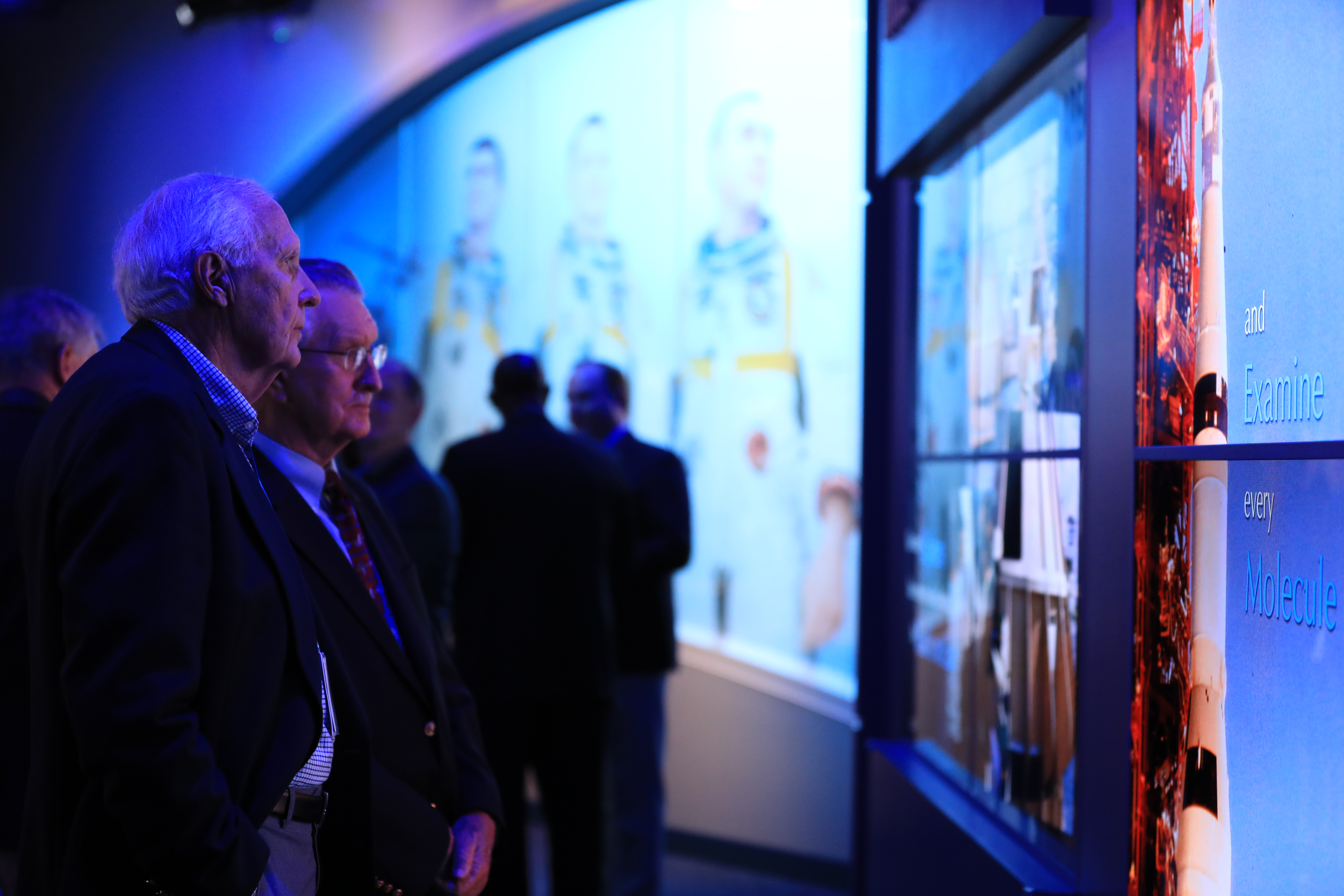 Guests observe areas of the newly opened Apollo 1 tribute at the Apollo/Saturn V Center at NASA's Kennedy Space Center opened Jan. 27, 2017. Astronauts Gus Grissom, Ed White II and Chaffee perished in a fire at the launch pad on Jan. 27, 1967, during training for the mission. The tribute highlights the lives and careers of the astronauts. The tribute features numerous items recalling the lives of the three astronauts. The tribute also includes the three-part hatch to the spacecraft itself, the first time any part of the Apollo 1 spacecraft has been displayed publicly. A version of the hatch after it was redesigned is also showcased as an example of improvements NASA made throughout the agency and to the Apollo spacecraft that would later carry astronauts to the moon.