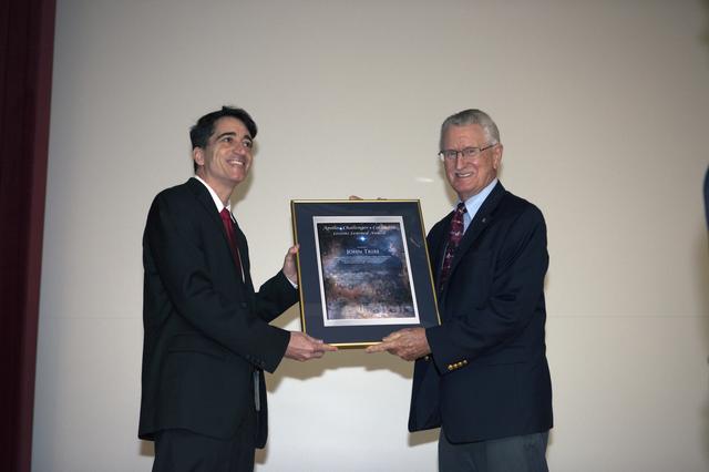 Mike Ciannilli, at left, the Apollo, Challenger, Columbia Lessons Learned Program manager, presents a certificate to John Tribe, retired, Apollo 1 Reaction and Control System lead engineer, during the Apollo 1 Lessons Learned presentation in the Training Auditorium at NASA's Kennedy Space Center in Florida. The theme of the program was "To there and Back Again." The event helped pay tribute to the Apollo 1 crew, Gus Grissom, Ed White II, and Roger Chaffee.