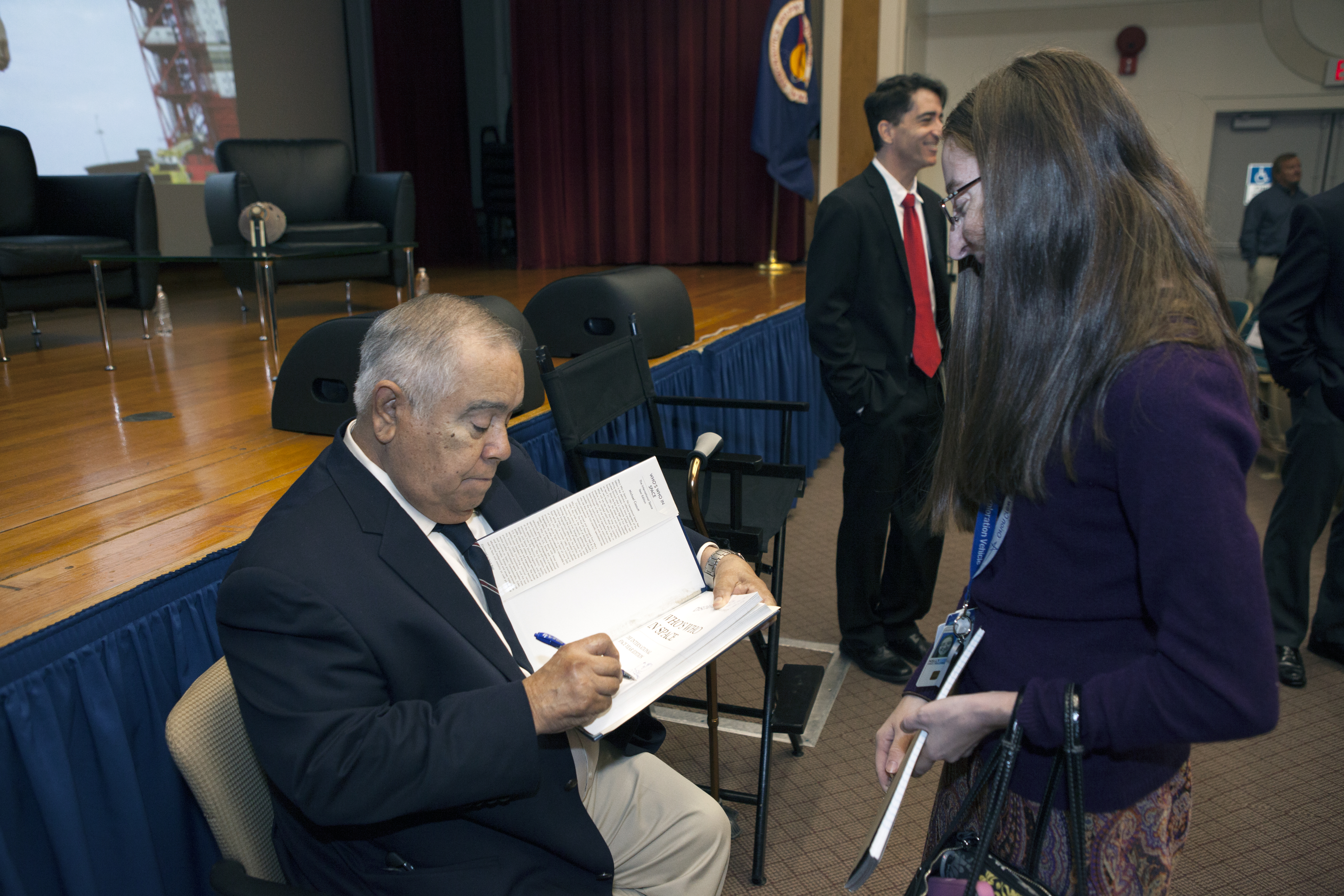 Ernie Reyes, retired, former Apollo 1 senior operations manager, signs a book for a worker after the Apollo 1 Lessons Learned presentation in the Training Auditorium at NASA's Kennedy Space Center in Florida. The theme of the program was "To there and Back Again." The event helped pay tribute to the Apollo 1 crew, Gus Grissom, Ed White II, and Roger Chaffee.