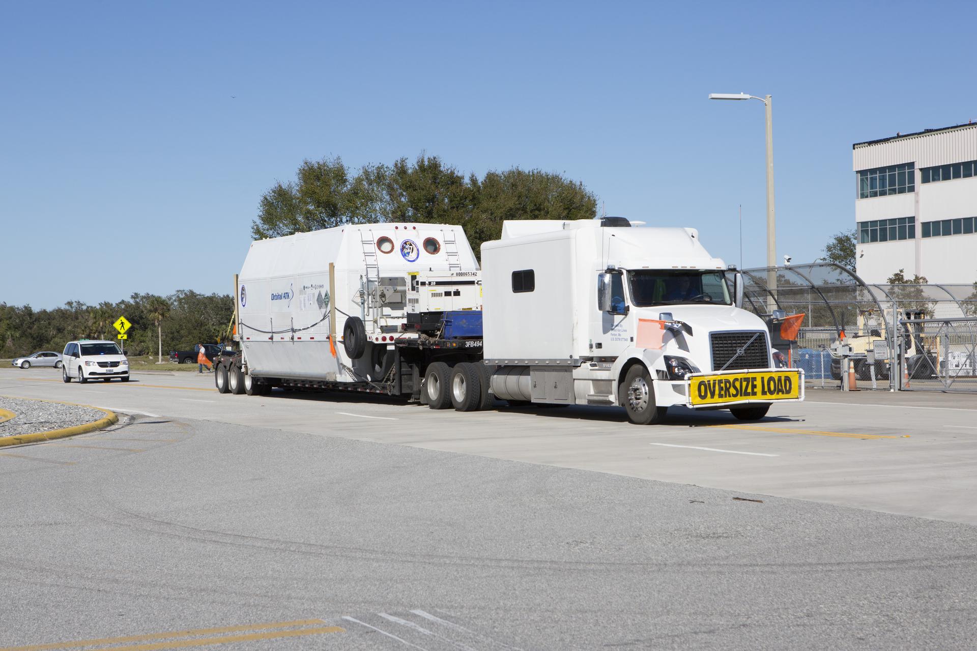The Orbital ATK OA-7 Cygnus spacecraft's service module arrives inside the Space Station Processing Facility of NASA's Kennedy Space Center in Florida. The service module is sealed in an environmentally controlled shipping container, pulled in by truck on a low-boy flatbed trailer. Scheduled to launch on March 19, 2017, the Orbital ATK OA-7 mission will lift off atop a United Launch Alliance Atlas V rocket from Space launch Complex 41 at Cape Canaveral Air Force Station. The commercial resupply services mission to the International Space Station will deliver thousands of pounds of supplies, equipment and scientific research materials that improve life on Earth and drive progress toward future space exploration.