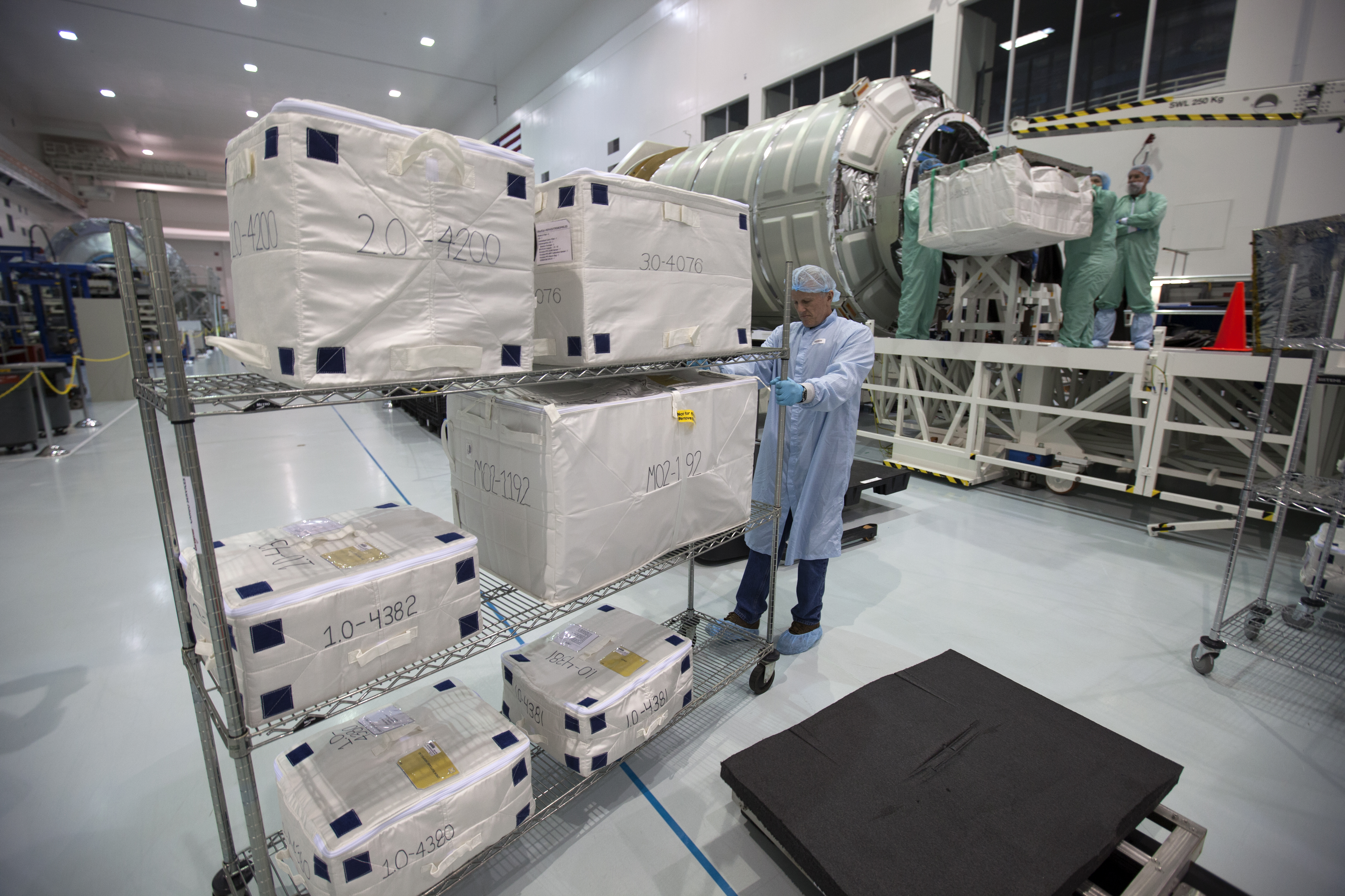 In the Space Station Processing Facility at NASA's Kennedy Space Center in Florida, technicians and engineers load thousands of pounds of supplies, equipment and scientific research materials aboard a Cygnus spacecraft's pressurized cargo module (PCM) for the Orbital ATK CRS-7 mission to the International Space Station. Scheduled to launch on March 19, 2017, the commercial resupply services mission will lift off atop a United Launch Alliance Atlas V rocket from Space launch Complex 41 at Cape Canaveral Air Force Station.