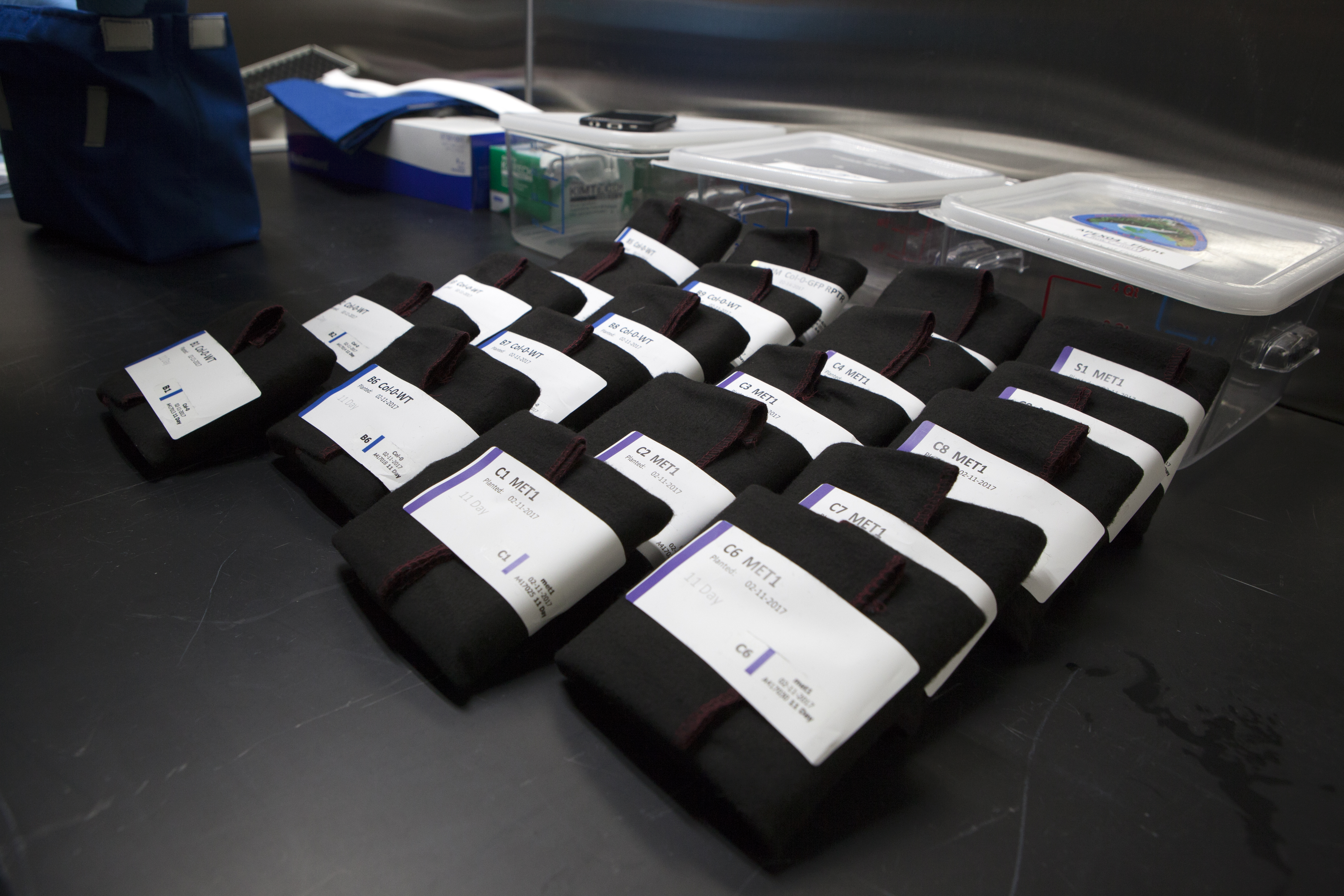 APEX-04, or Advanced Plant EXperiments-04, is being prepared in a cold room in the Kennedy Space Center Processing Facility for SpaceX-10. The petri plates are wrapped in black cloth and kept cold (+4 degrees Celsius) to prevent them from germinating prior to the experiment start on station. Dr. Anna Lisa Paul of the University of Florida is the principal investigator for APEX-04. Apex-04 is an experiment involving Arabidopsis in petri plates inside the Veggie facility aboard the International Space Station. Since Arabidopsis is the genetic model of the plant world, it is a perfect sample organism for performing genetic studies in spaceflight. The experiment is the result of a grant from NASA’s Space Life and Physical Sciences division.