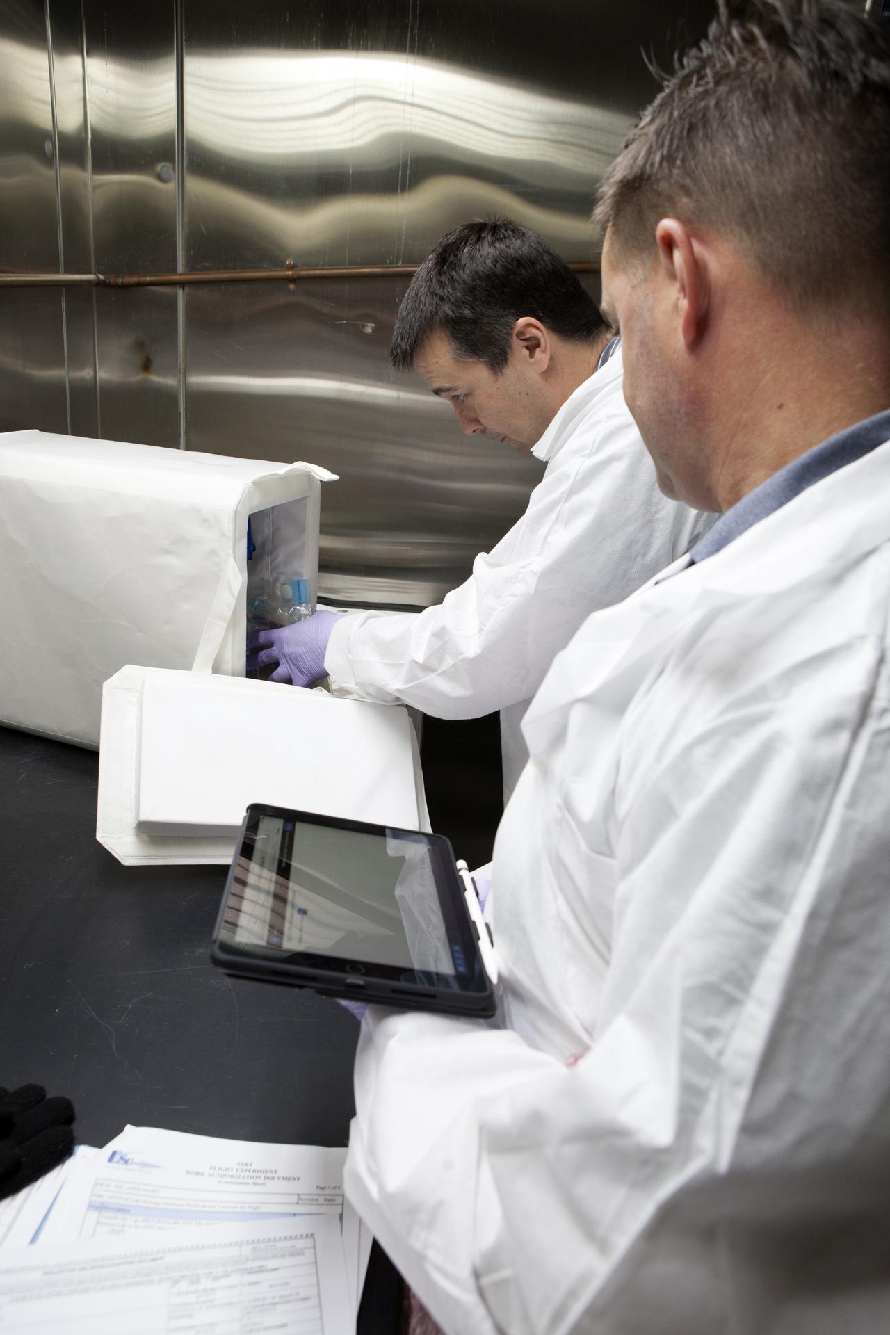 APEX-04, or Advanced Plant EXperiments-04, is being prepared in a cold room in the Kennedy Space Center Processing Facility for SpaceX-10. Eric Morris from the cold stowage group fits items into the Double Cold Bag (DCB) which is a non-powered container that keeps the APEX petri plates at +4 degrees Celsius during launch and ascent.. Dr. Anna Lisa Paul of the University of Florida is the principal investigator for APEX-04. Apex-04 is an experiment involving Arabidopsis in petri plates inside the Veggie facility aboard the International Space Station. Since Arabidopsis is the genetic model of the plant world, it is a perfect sample organism for performing genetic studies in spaceflight. The experiment is the result of a grant from NASA’s Space Life and Physical Sciences division.