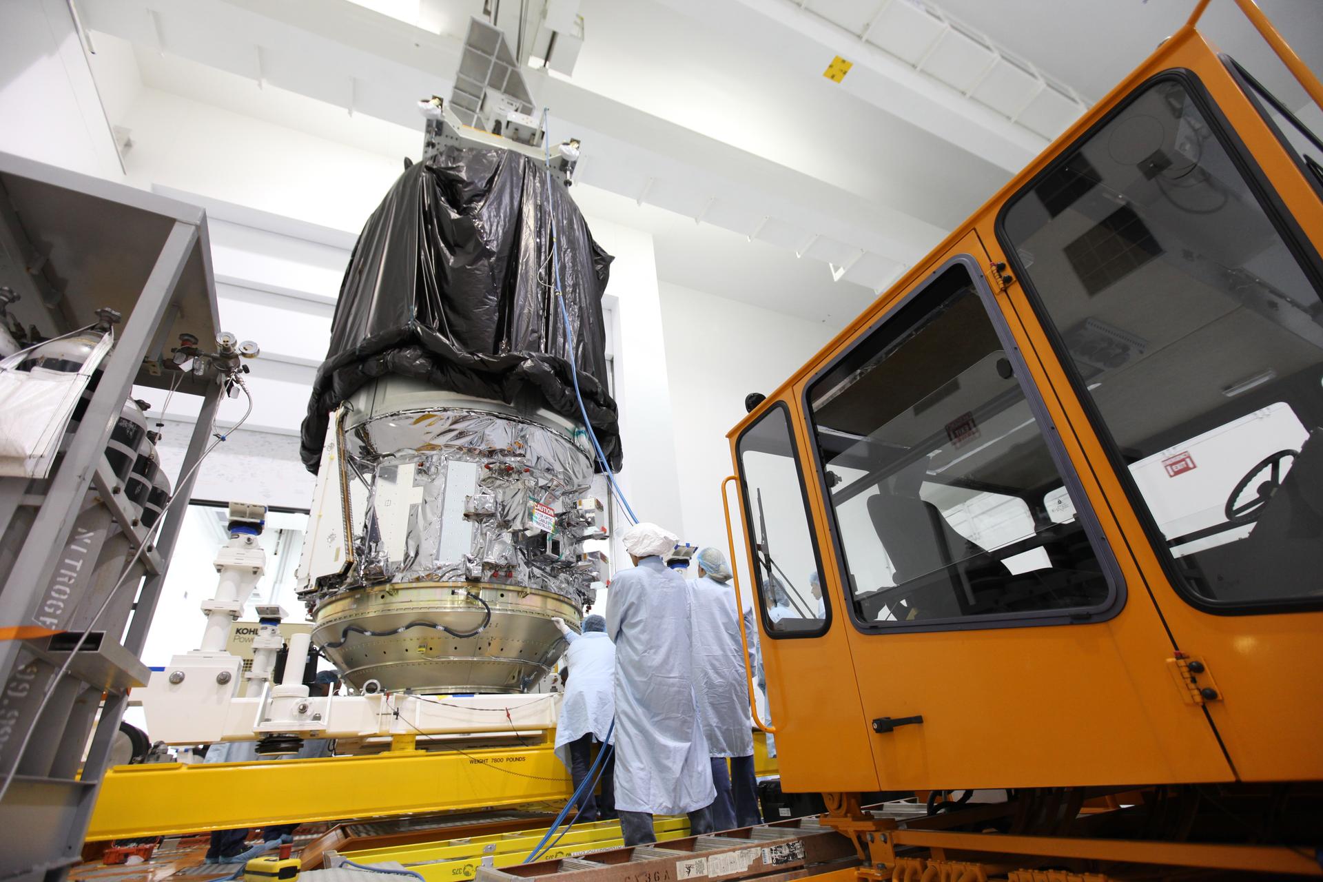 In the Space Station Processing Facility high bay at NASA's Kennedy Space Center in Florida, technicians secure the Orbital ATK CYGNUS pressurized cargo module on the KAMAG transporter. The module will be transported to the Payload Hazardous Servicing Facility. The Orbital ATK CRS-7 commercial resupply services mission to the International Space Station is scheduled to launch atop a United Launch Alliance Atlas V rocket from Space Launch Complex 41 at Cape Canaveral Air Force Station on March 19, 2017. CYGNUS will deliver thousands of pounds of supplies, equipment and scientific research materials to the space station.