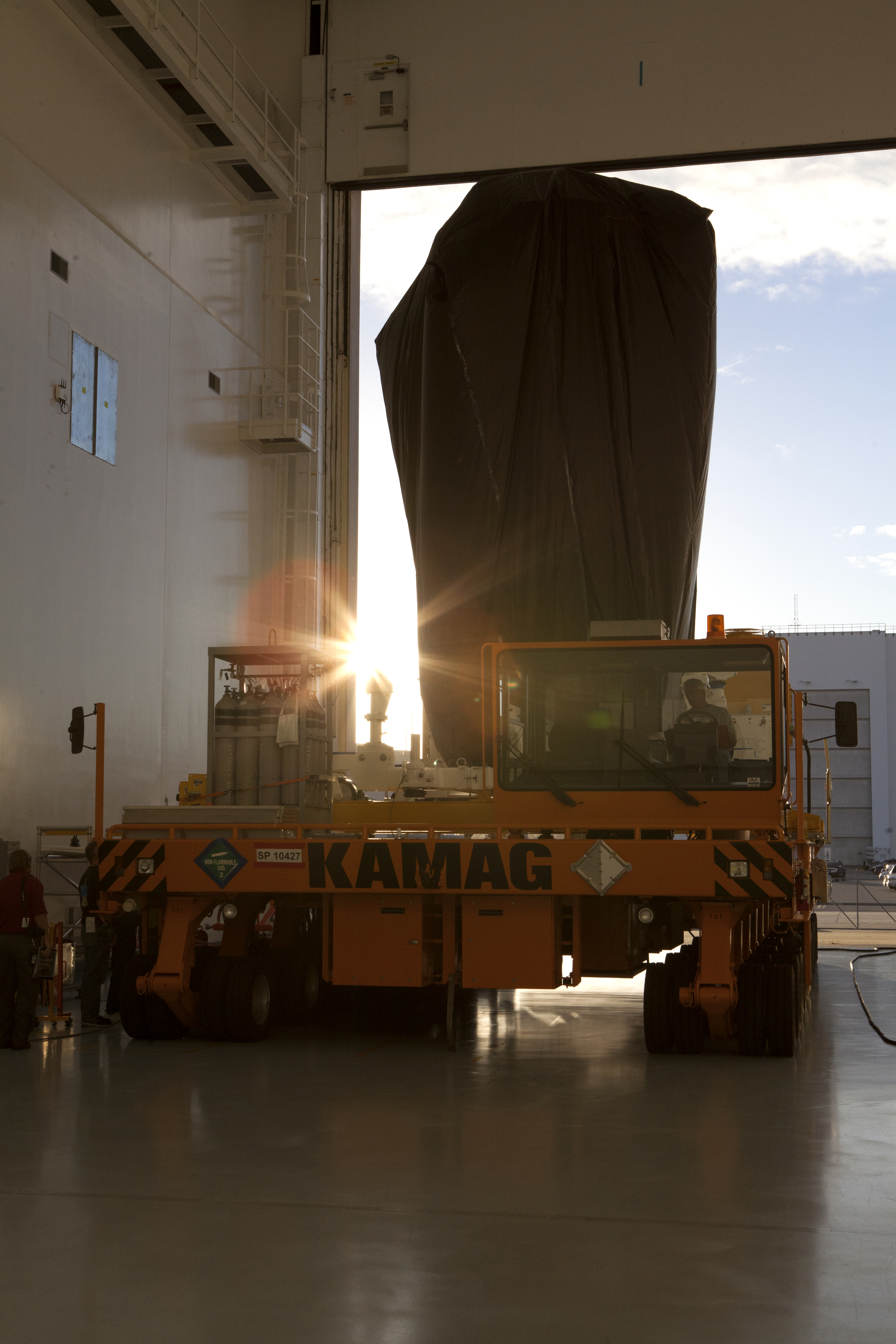 A KAMAG transporter with Orbital ATK's CYGNUS pressurized cargo module secured on top exits the Space Station Processing Facility at NASA's Kennedy Space Center in Florida. CYGNUS will be transported to the Payload Hazardous Servicing Facility for final propellant loading and late cargo stowage. The Orbital ATK CRS-7 commercial resupply services mission to the International Space Station is scheduled to launch atop a United Launch Alliance Atlas V rocket from Space Launch Complex 41 at Cape Canaveral Air Force Station on March 19, 2017. CYGNUS will deliver thousands of pounds of supplies, equipment and scientific research materials to the space station.