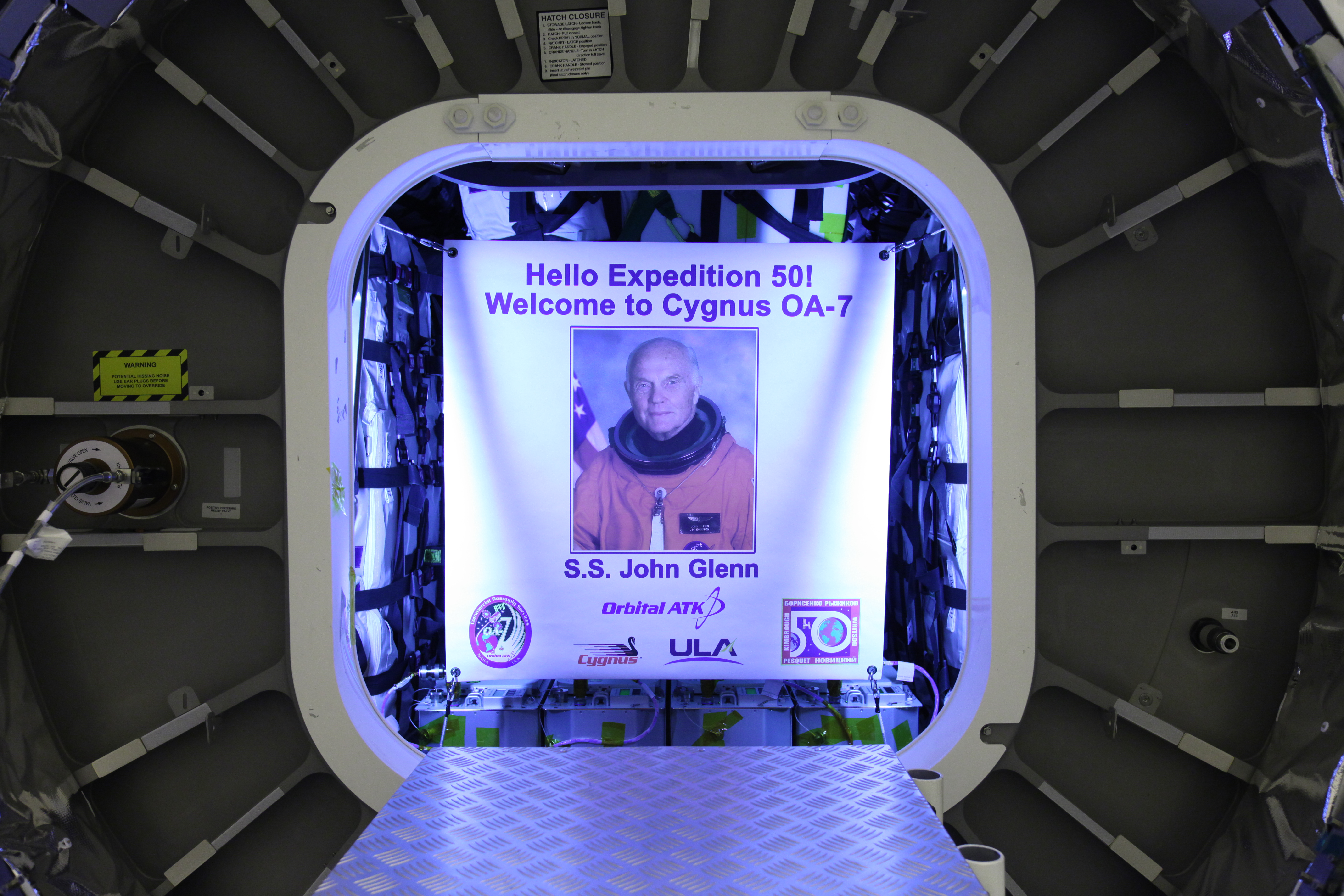 Inside the Payload Hazardous Servicing Facility at NASA's Kennedy Space Center in Florida, the John Glenn banner is attached inside the Orbital ATK Cygnus pressurized cargo module. The Cygnus cargo module has been renamed the S.S. John Glenn to honor the late former Project Mercury and space shuttle astronaut. The Orbital ATK CRS-7 commercial resupply services mission to the International Space Station is scheduled to launch atop a United Launch Alliance Atlas V rocket from Space Launch Complex 41 at Cape Canaveral Air Force Station no earlier than March 21, 2017. Cygnus will deliver 7,600 pounds of supplies, equipment and scientific research materials to the space station.