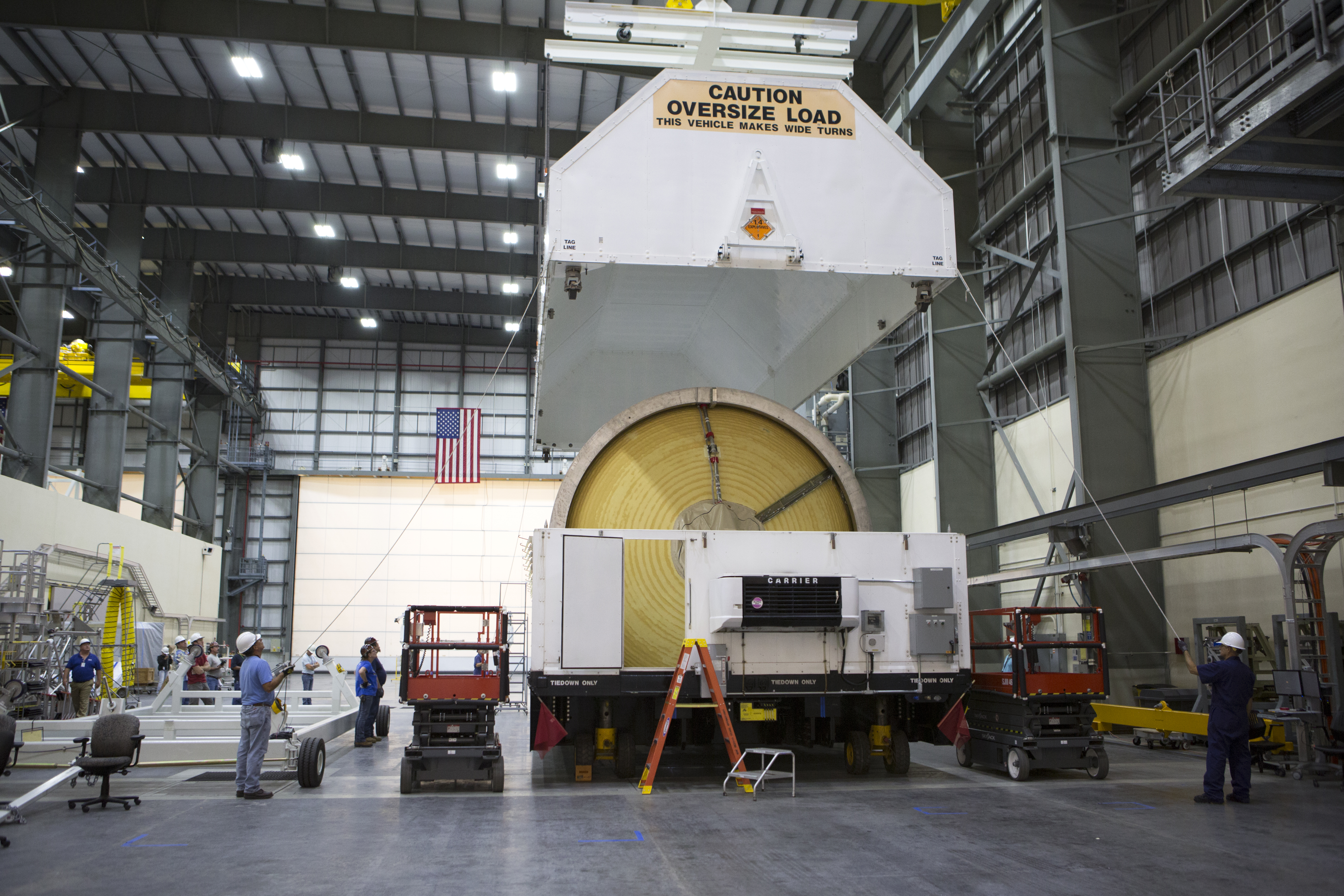 Inside the United Launch Alliance (ULA) Horizontal Integration Facility at Cape Canaveral Air Force Station in Florida, technicians assists as a crane lifts the shipping container cover away from the Interim Cryogenic Propulsion Stage (ICPS) for NASA's Space Launch System rocket. The ICPS is the first integrated piece of flight hardware to arrive for the SLS. The ICPS arrived from the ULA facility in Decatur, Alabama. The ICPS is the in-space stage that is located toward the top of the rocket, between the Launch Vehicle Stage Adapter and the Orion Spacecraft Adapter. It will provide some of the in-space propulsion during Orion's first flight test atop the SLS on Exploration Mission 1.