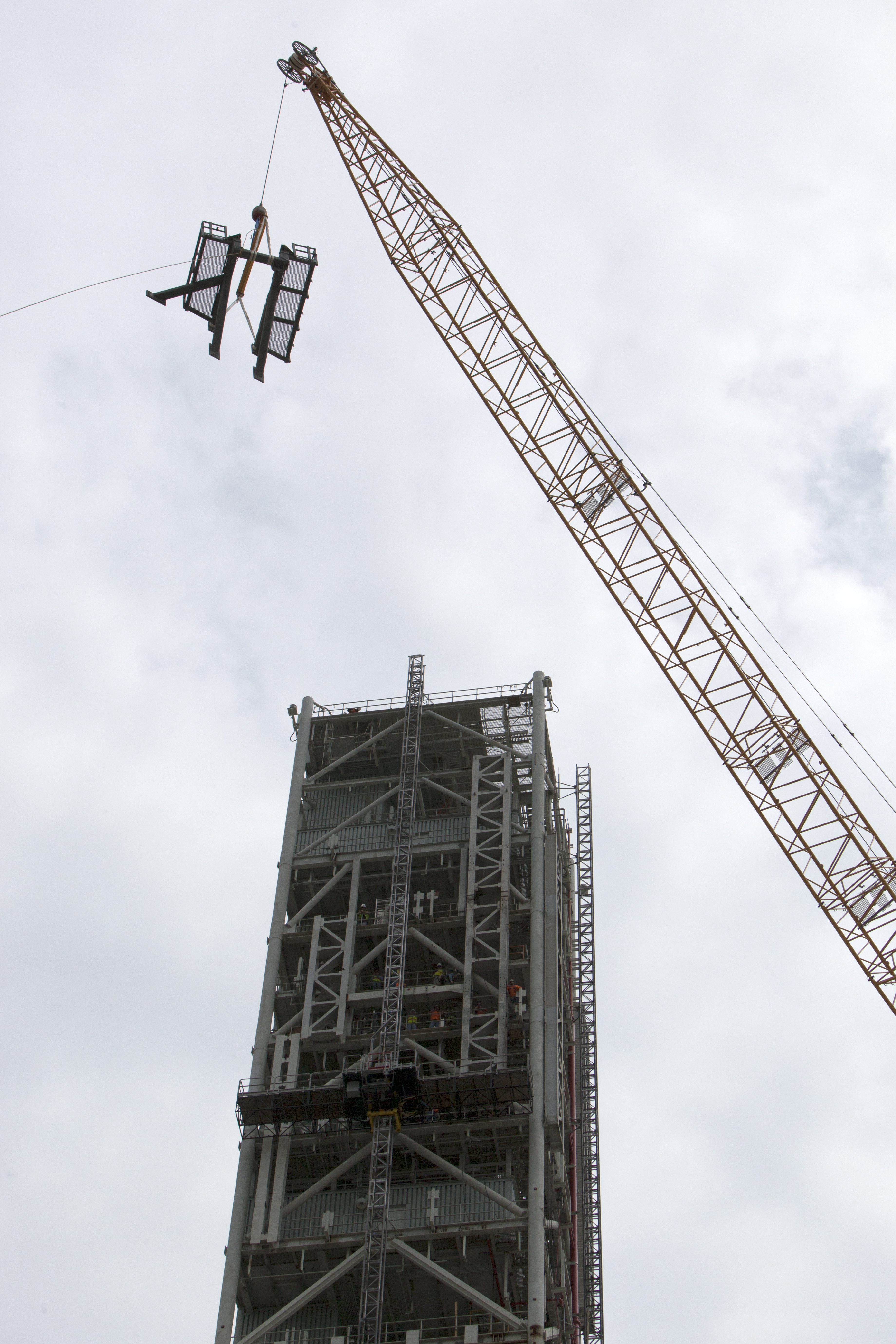 A crane lifts the bracket for the Orion Service Module Umbilical (OSMU) high up for installation on the mobile launcher tower at NASA's Kennedy Space Center in Florida. The mobile launcher tower will be equipped with a number of lines, called umbilicals, that will connect to the Space Launch System rocket and Orion spacecraft for Exploration Mission-1 (EM-1). The OSMU will be located high on the mobile launcher tower and, prior to launch, will transfer liquid coolant for the electronics and air for the Environmental Control System to the Orion service module that houses these critical systems to support the spacecraft. EM-1 is scheduled to launch in 2018. The Ground Systems Development and Operations Program is overseeing installation of the umbilicals.