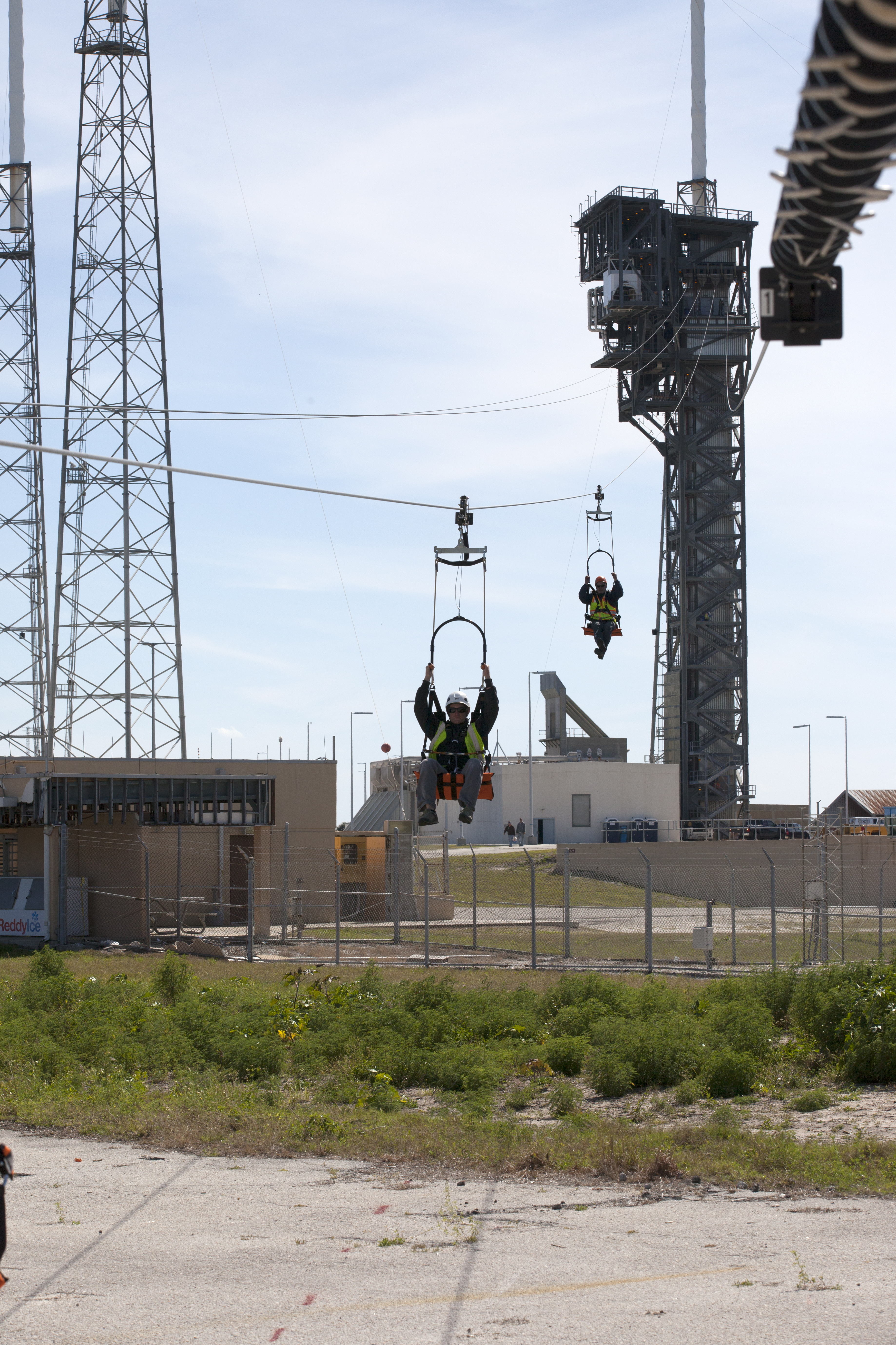 Two engineers evaluate the Emergency Egress System as they ride in folding seats attached to slide wires at Space Launch Complex 41. United Launch Alliance and Boeing continue modifications to the pad in order to host missions by the Boeing CST-100 Starliner carrying astronauts and crew. The system recently completed its final test. In the unlikely event of an emergency prior to liftoff, each person on the Crew Access Tower would get into their own seat attached to the wire and slide more than 1,340 feet to a safe area. The wires are situated 172 feet above the pad deck on level 12 of the tower. The Starliner will launch on a ULA Atlas V on mission to low-Earth orbit including those flying astronauts to the International Space Station during missions by NASA's Commercial Crew Program.