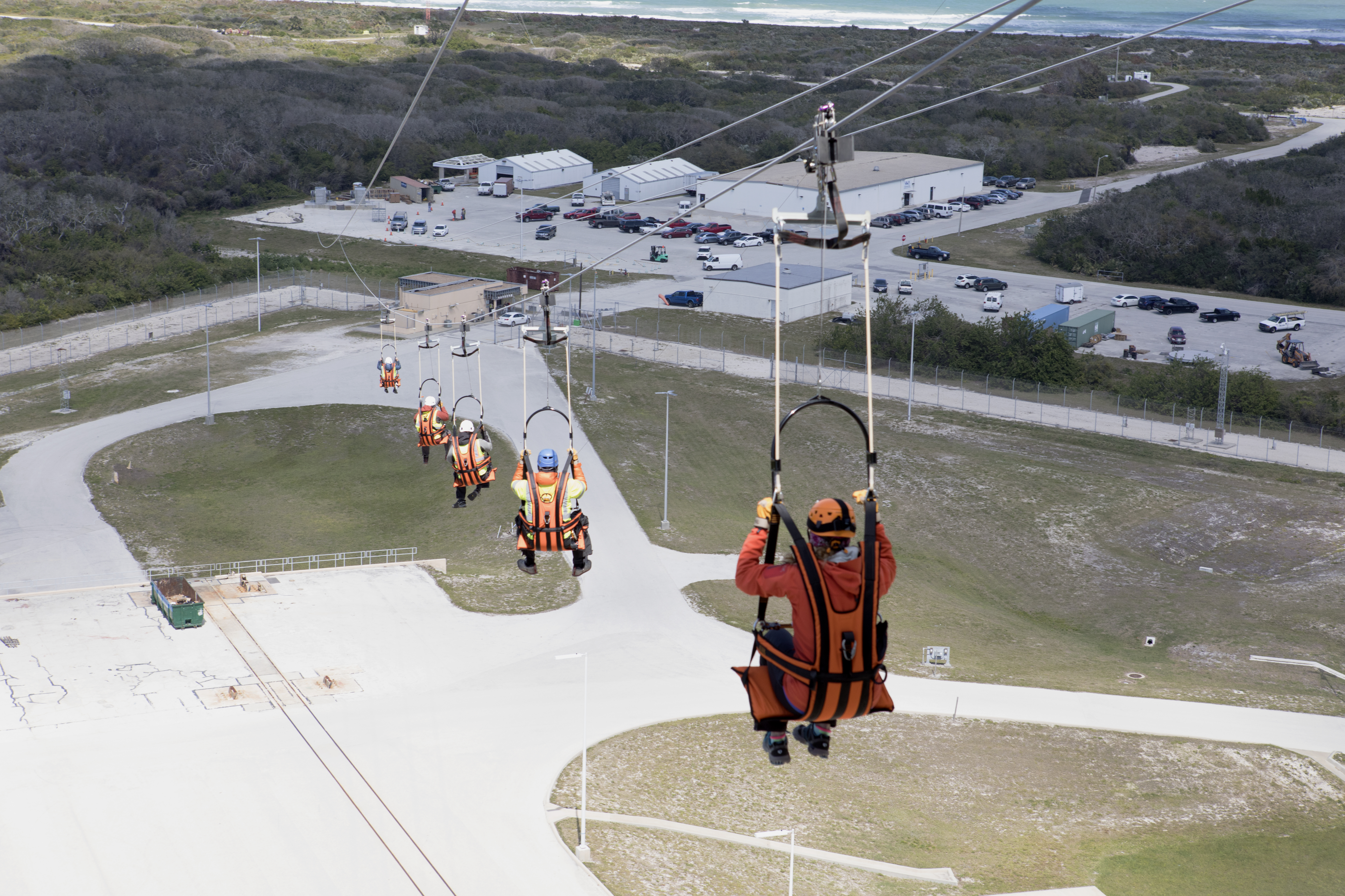 Engineers evaluate the Emergency Egress System as they ride in folding seats attached to slide wires at Space Launch Complex 41. United Launch Alliance and Boeing continue modifications to the pad in order to host missions by the Boeing CST-100 Starliner carrying astronauts and crew. The system recently completed its final test. In the unlikely event of an emergency prior to liftoff, each person on the Crew Access Tower would get into their own seat attached to the wire and slide more than 1,340 feet to a safe area. The wires are situated 172 feet above the pad deck on level 12 of the tower. The Starliner will launch on a ULA Atlas V on mission to low-Earth orbit including those flying astronauts to the International Space Station during missions by NASA's Commercial Crew Program.