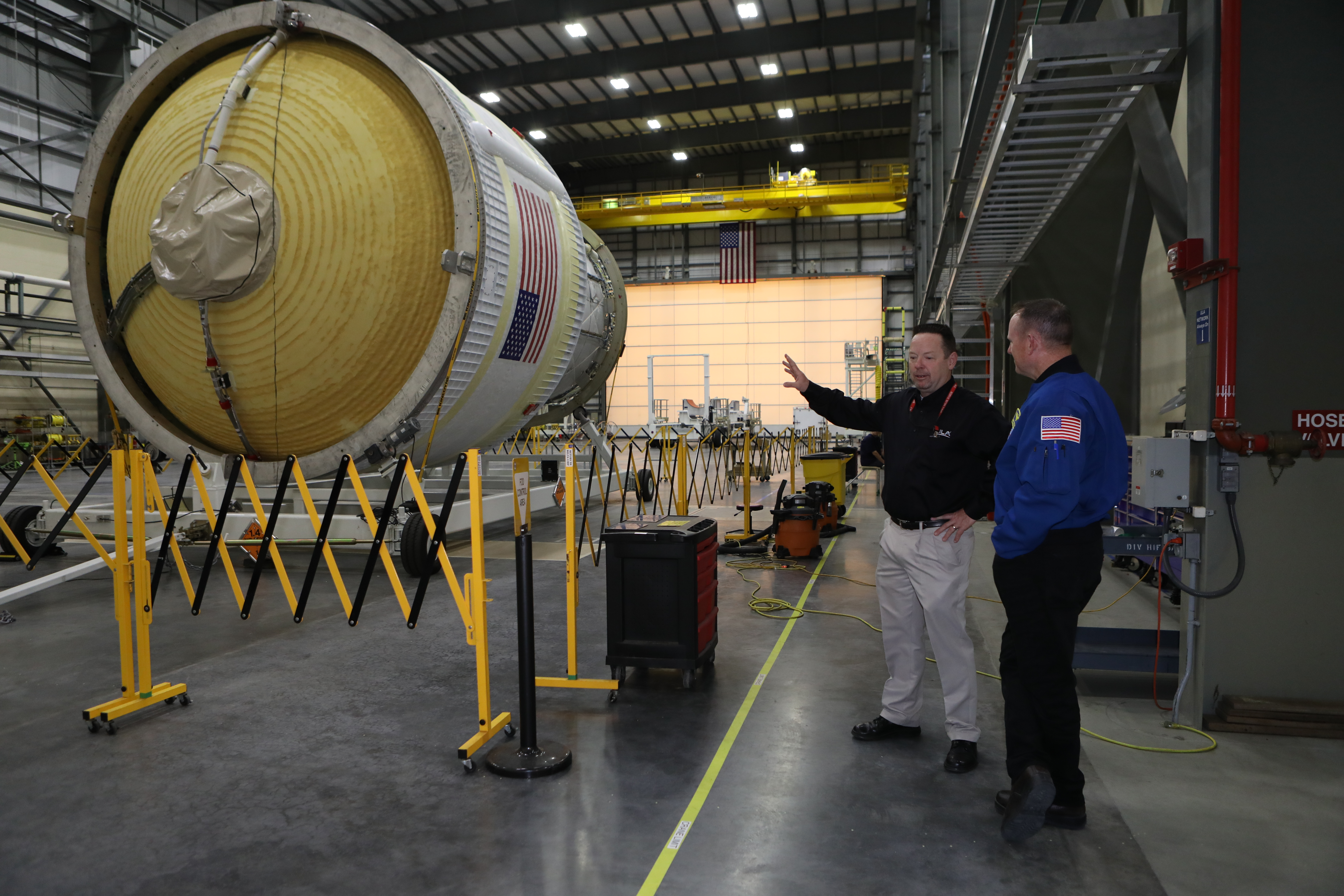 Inside the United Launch Alliance Horizontal Integration Facility at Cape Canaveral Air Force Station in Florida, NASA astronaut Barry "Butch" Wilmore views the first integrated piece of flight hardware for NASA's Space Launch System (SLS) rocket, the Interim Cryogenic Propulsion Stage (ICPS). The ICPS is the in-space stage that is located toward the top of the rocket, between the Launch Vehicle Stage Adapter and the Orion Spacecraft Adapter. It will provide some of the in-space propulsion during Orion's first flight test atop the SLS on Exploration Mission 1.