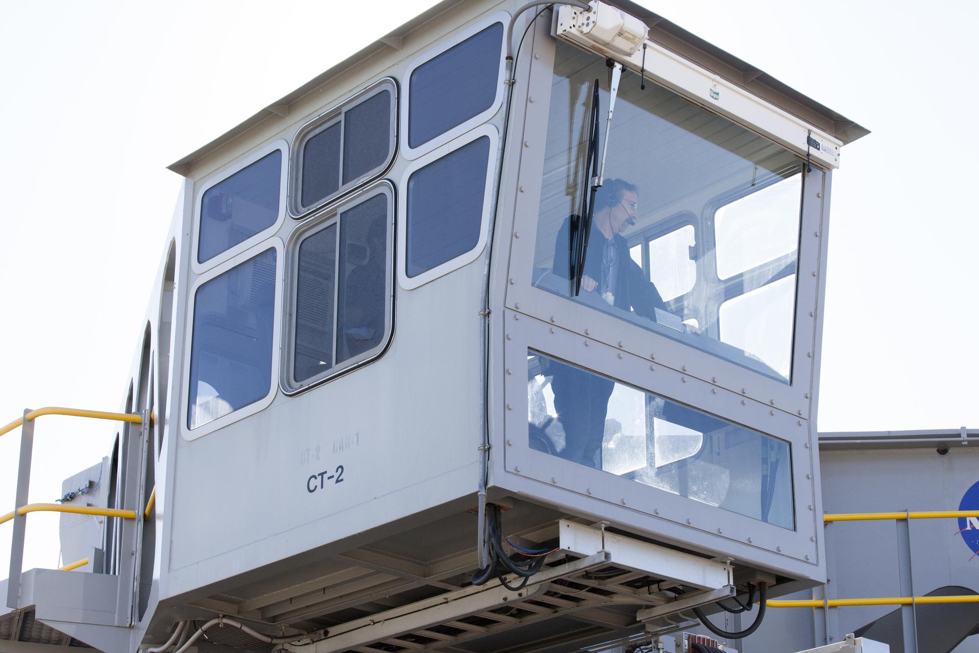Brad Lawarre, a crawler engineer and driver on the Test and Operations Support Contract, monitors the progress from one of the crawler-transporter 2 (CT-2) cabs as the vehicle moves slowly along the crawlerway toward the Vehicle Assembly Building at NASA's Kennedy Space Center Florida. The crawler took a trip to the Pad A/B split to test upgrades recently completed that will allow the giant vehicle to handle the load of the agency's Space Launch System rocket and Orion spacecraft atop the mobile launcher. The Ground Systems Development and Operations Program oversaw upgrades to the 50-year-old CT-2. New generators, gear assemblies, jacking, equalizing and leveling (JEL) hydraulic cylinders, roller bearings and brakes were installed, and other components were upgraded to prepare for Exploration Mission 1.