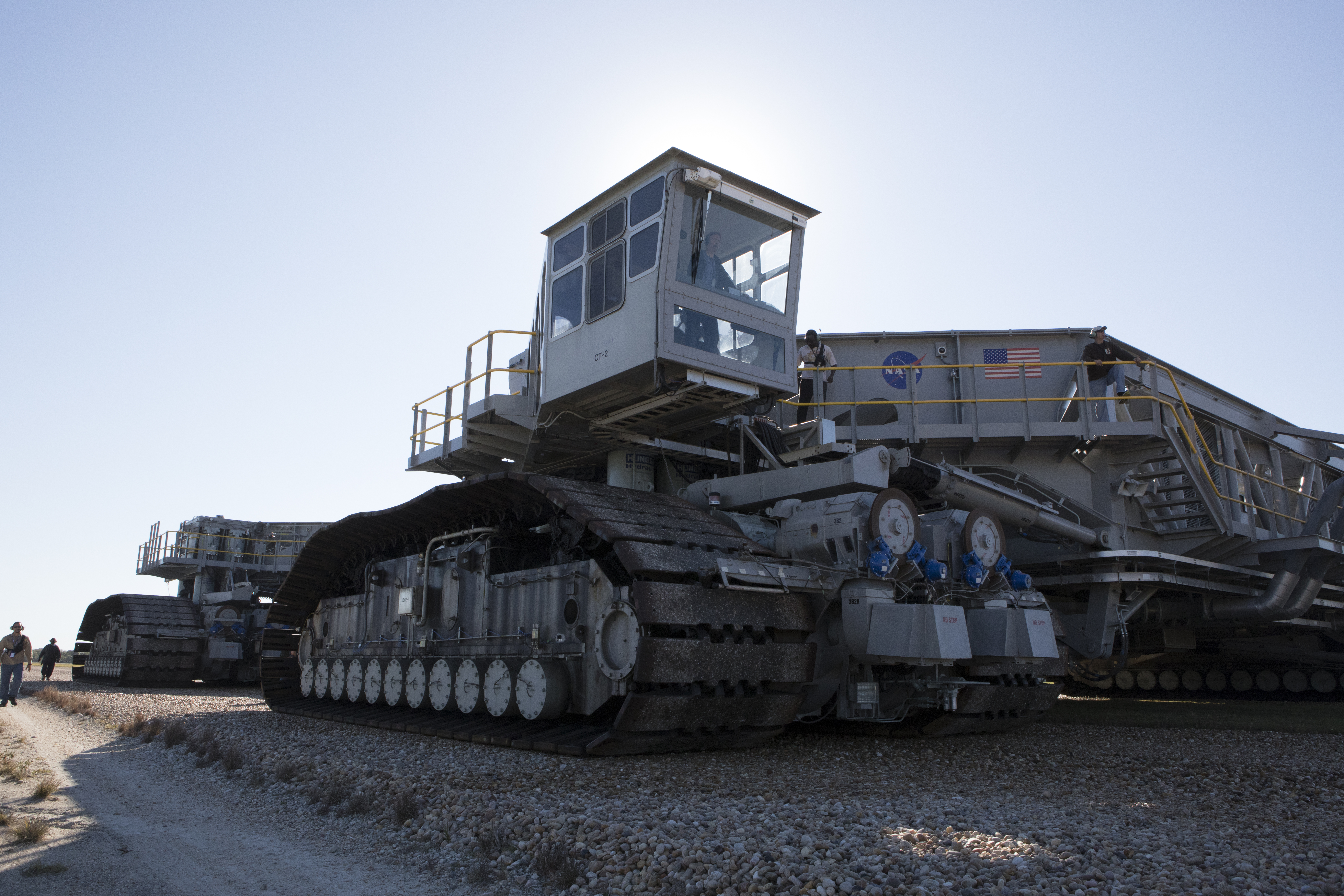 Ground support technicians walks alongside crawler-transporter 2 (CT-2) as the vehicle moves slowly along the crawlerway toward the Vehicle Assembly Building at NASA's Kennedy Space Center in Florida. The crawler took a trip to the Pad A/B split to test upgrades recently completed that will allow the giant vehicle to handle the load of the agency's Space Launch System rocket and Orion spacecraft atop the mobile launcher. The Ground Systems Development and Operations Program oversaw upgrades to the 50-year-old CT-2. New generators, gear assemblies, jacking, equalizing and leveling (JEL) hydraulic cylinders, roller bearings and brakes were installed, and other components were upgraded to prepare for Exploration Mission 1.
