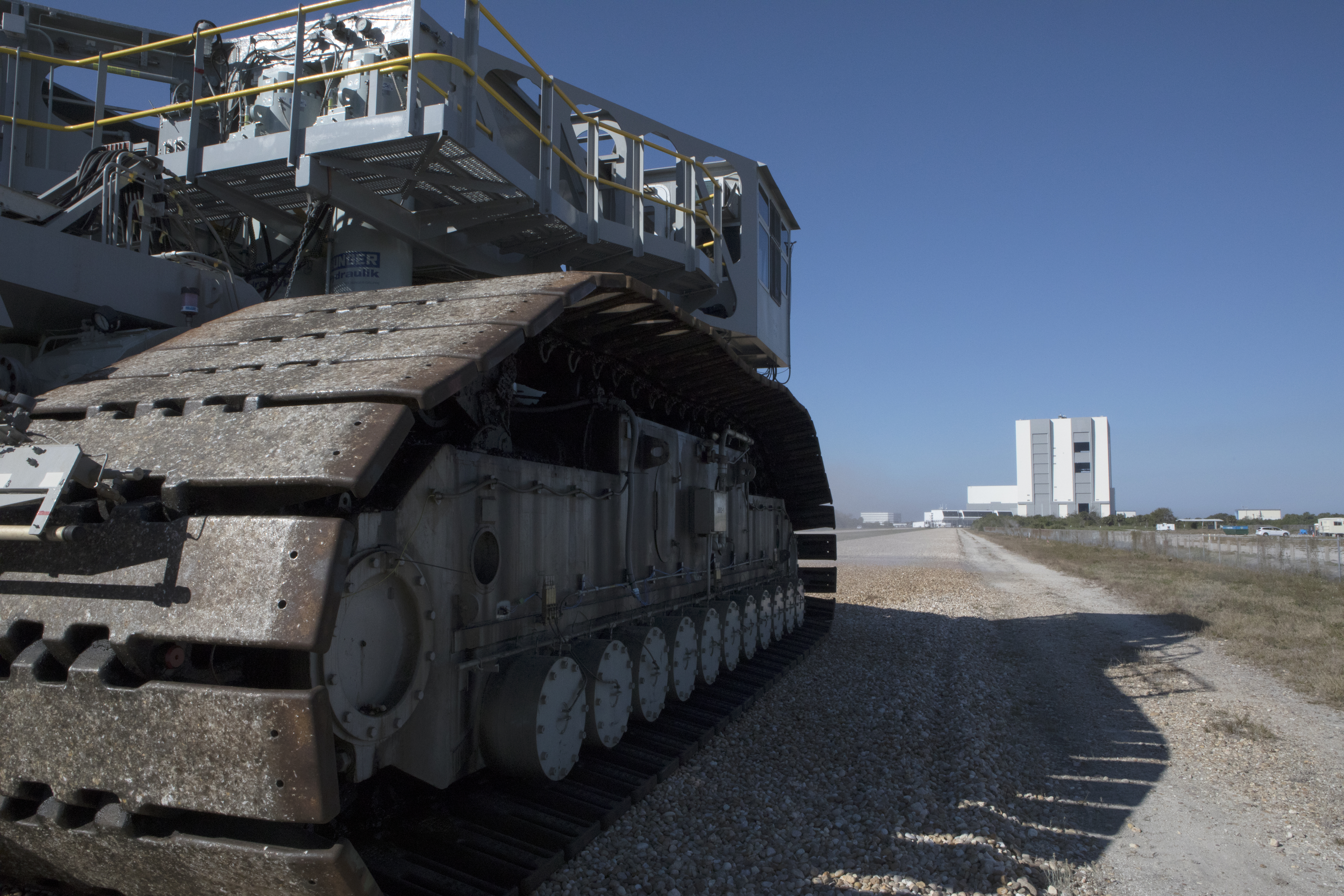 Crawler-transporter 2 (CT-2) moves slowly along the crawlerway toward the Vehicle Assembly Building (in the background) at NASA's Kennedy Space Center in Florida. The crawler took a trip to the Pad A/B split to test upgrades recently completed that will allow the giant vehicle to handle the load of the agency's Space Launch System rocket and Orion spacecraft atop the mobile launcher. The Ground Systems Development and Operations Program oversaw upgrades to the 50-year-old CT-2. New generators, gear assemblies, jacking, equalizing and leveling (JEL) hydraulic cylinders, roller bearings and brakes were installed, and other components were upgraded to prepare for Exploration Mission 1.