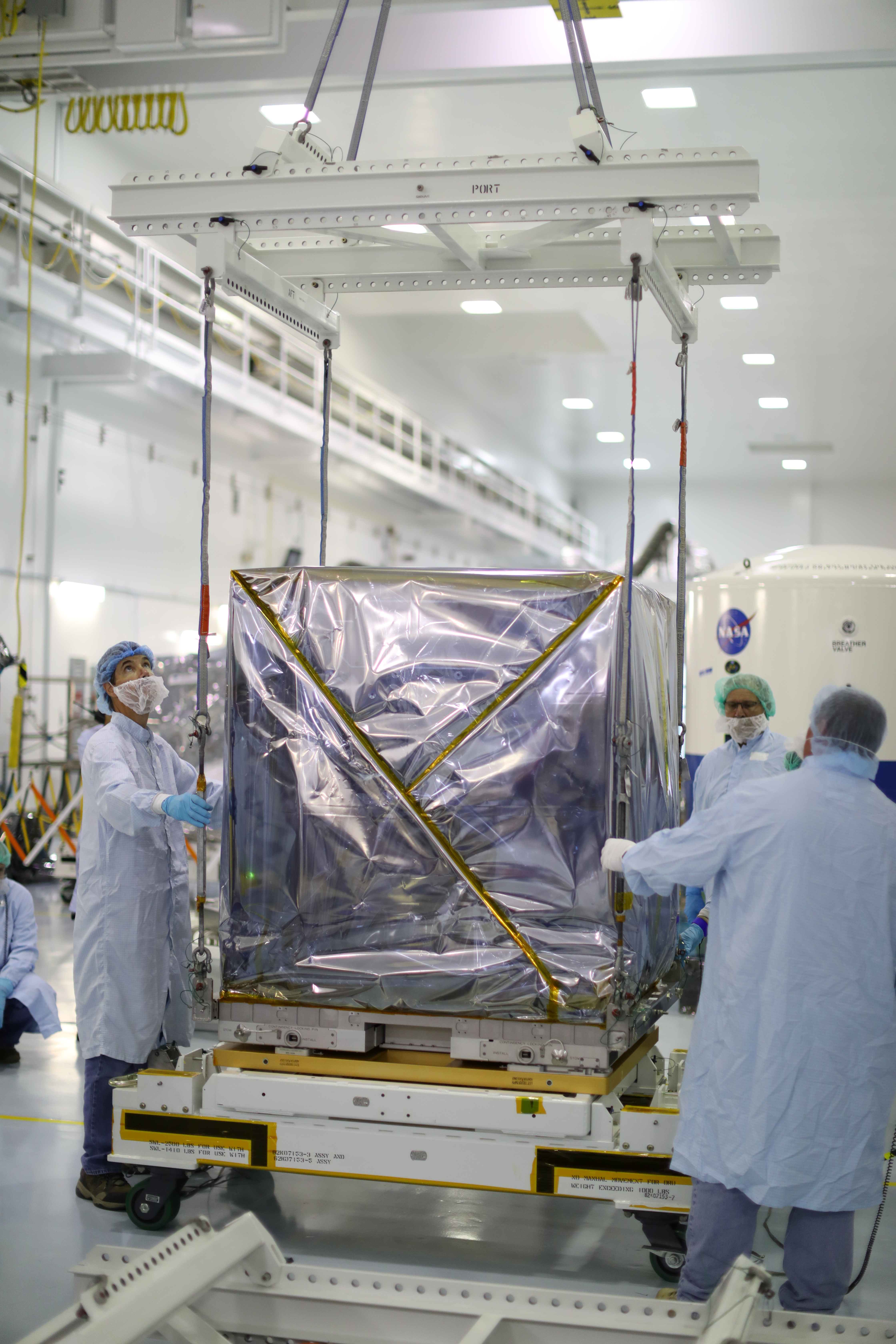 Inside the Space Station Processing Facility high bay at NASA's Kennedy Space Center in Florida, technicians assist as a crane is used to lift the Neutron star Interior Composition Explorer, or NICER, payload up from its carrier. NICER will be delivered to the International Space Station aboard the SpaceX Dragon cargo carrier on the company’s 11th commercial resupply services mission to the space station. NICER will study neutron stars through soft X-ray timing. NICER will enable rotation-resolved spectroscopy of the thermal and non-thermal emissions of neutron stars in the soft X-ray band with unprecedented sensitivity, probing interior structure, the origins of dynamic phenomena and the mechanisms that underlie the most powerful cosmic particle accelerators known.