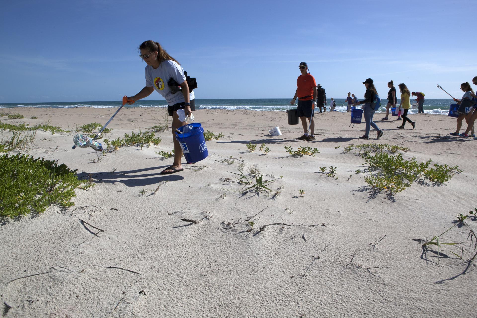 About 50 participants led by NASA Kennedy Space Center's Employee Resource Groups picked up about 20 bags of trash and other large debris along the center's shoreline before turtle-nesting season as a community service. Sea turtle-nesting season begins in about one month. Unlike what might be found along a public beach, all of the debris that litters Kennedy’s restricted beaches washes ashore after being discarded at sea. Of the 72 miles of beach that form the eastern boundary of Brevard County, Florida, about six of those miles line Kennedy.