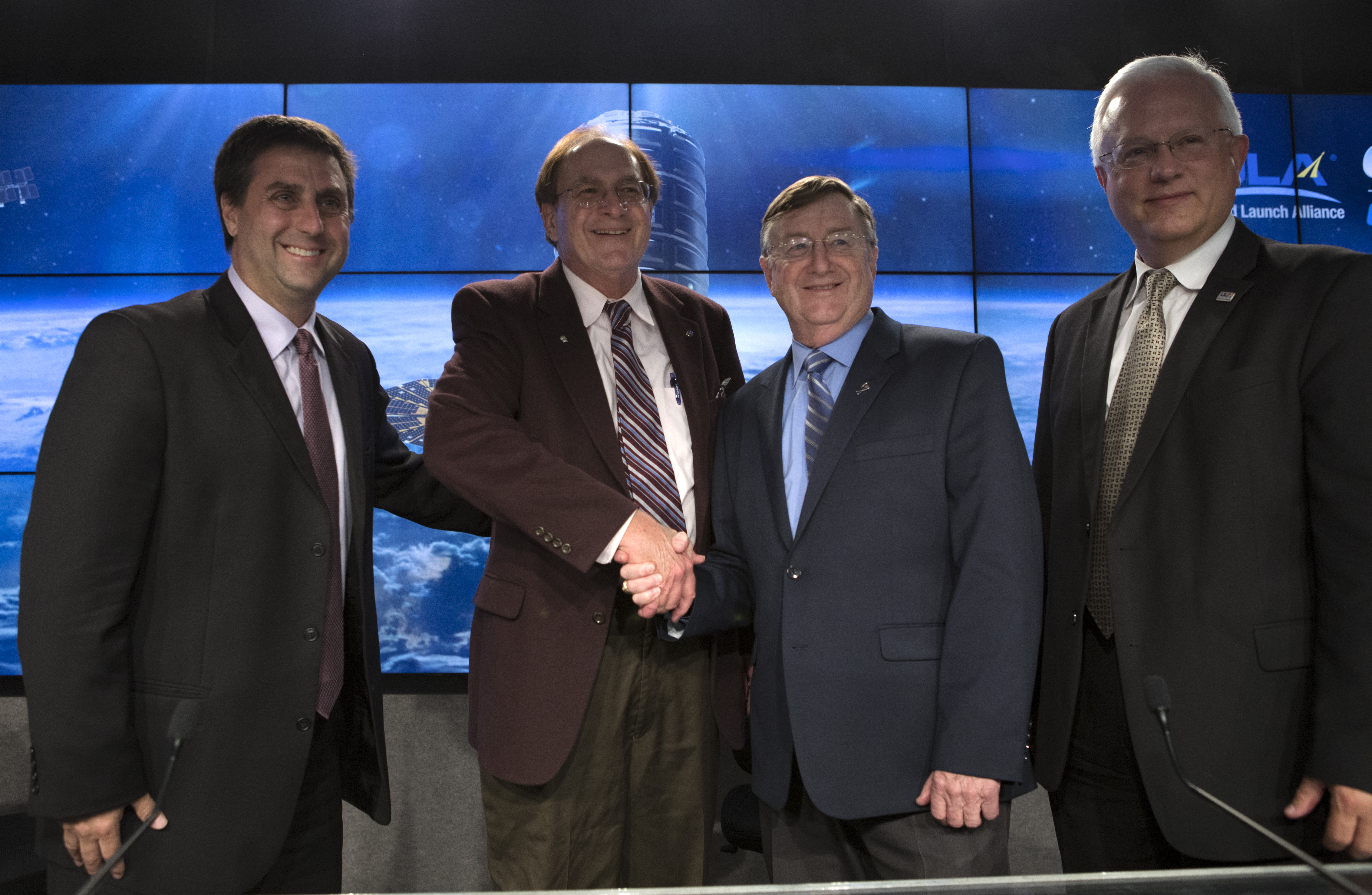 At the conclusion of the Orbital ATK CRS-7 post-launch press conference, moderator George Diller, second from left, NASA Kennedy Communications; shakes hands with Joel Montalbano, deputy manager, International Space Station Program, NASA Johnson Space Center in Houston. Also with them are Frank Culbertson, president, Orbital ATK Space Systems Group; and Vern Thorp, program manager, commercial missions, United Launch Alliance. A United Launch Alliance Atlas V rocket lifted off from Space Launch Complex 41 at Cape Canaveral Air Force Station in Florida, carrying Orbital ATK's Cygnus pressurized cargo module. It is Orbital ATK's seventh commercial resupply services mission to the International Space Station. Liftoff was at 11:11 a.m. EDT.
