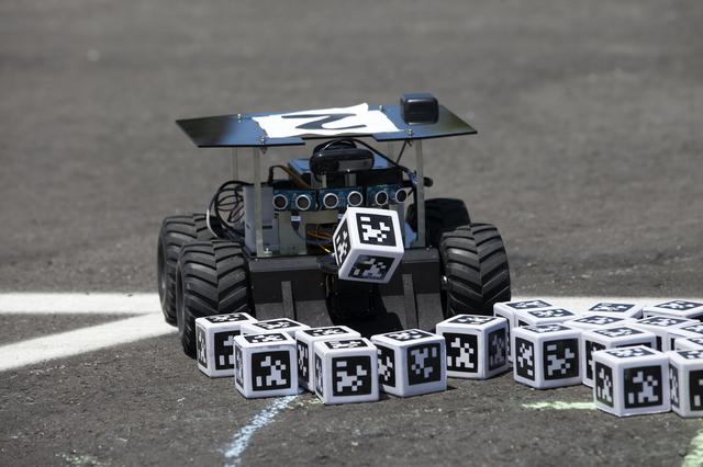 A Swarmie robot finds a "resource" cube marked with an AprilTag, similar to a barcode. In the Swarmathon competition at the Kennedy Space Center Visitor Complex, students were asked to develop computer code for the small robots, programming them to look for "resources" in the form of cubes with AprilTags.