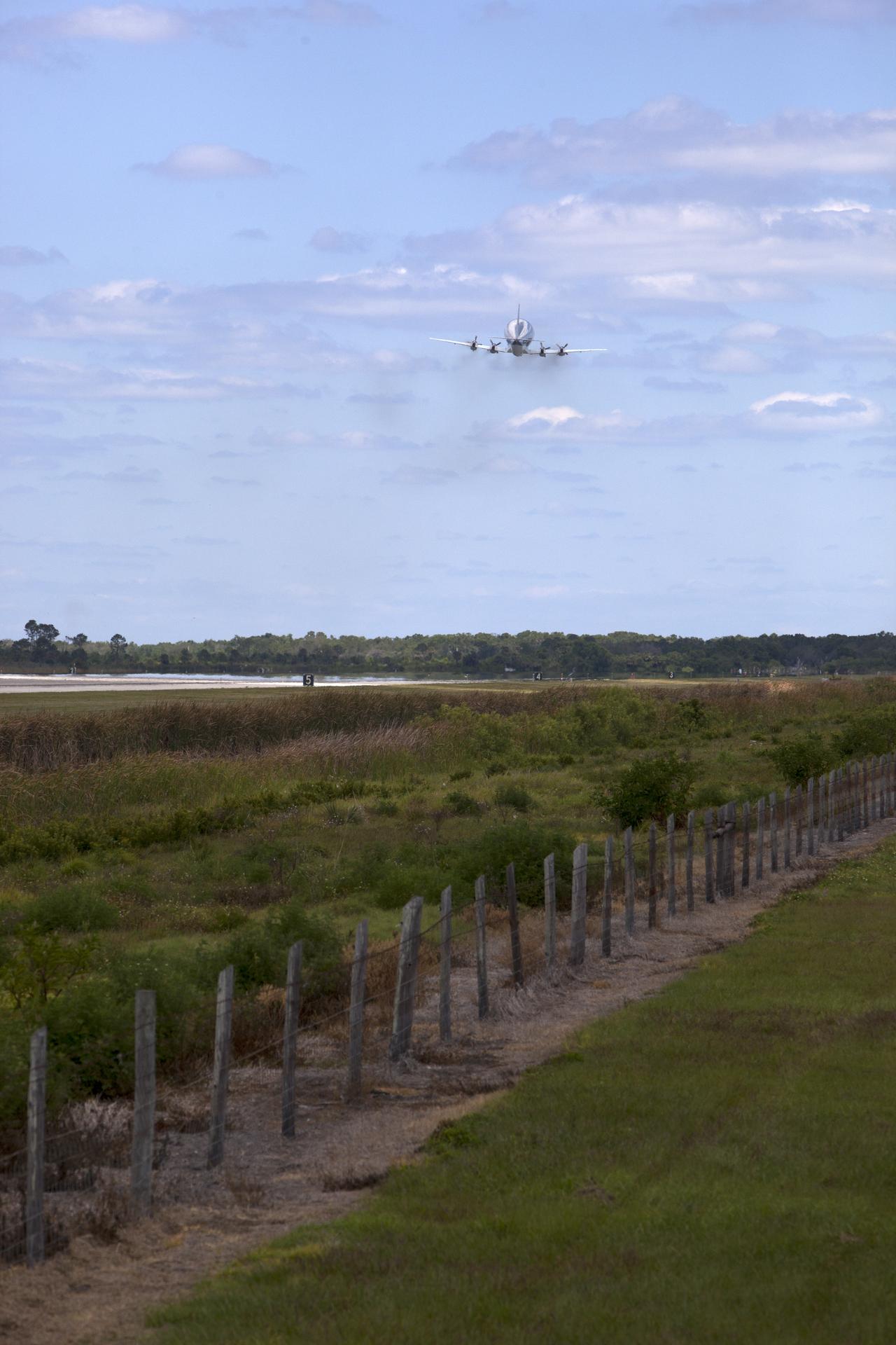 NASA's Super Guppy aircraft takes off from the runway at the Shuttle Landing Facility at NASA's Kennedy Space Center in Florida. The Orion Exploration Mission-1 (EM-1) structural test article, secured inside the Super Guppy, will be transported to Lockheed Martin's Denver facility for testing. The Orion spacecraft will launch atop NASA’s Space Launch System rocket on EM-1, its first deep space mission.