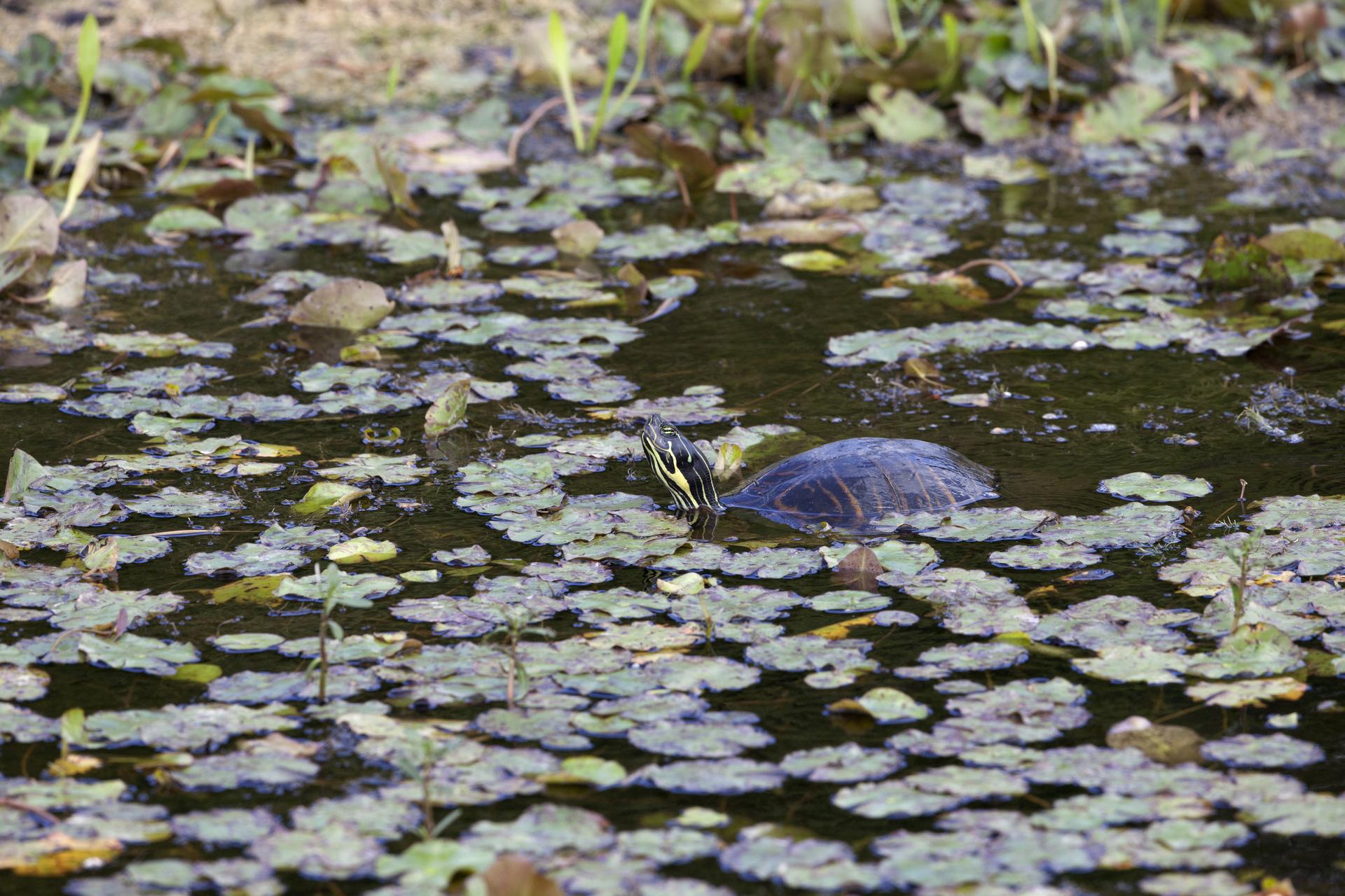 A turtle moves through a waterway at NASA's Kennedy Space Center in Florida. The center shares a border with the Merritt Island National Wildlife Refuge. More than 330 native and migratory bird species, 25 mammals, 117 fishes and 65 amphibians and reptiles call Kennedy and the wildlife refuge home.