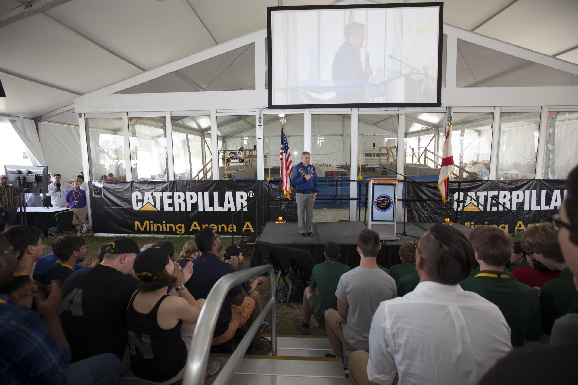 NASA Kennedy Space Center Director Bob Cabana welcomes participants to the agency's 8th Annual Robotic Mining Competition at the Kennedy Space Center Visitor Complex in Florida. More than 40 student teams from colleges and universities around the U.S. will use their mining robots to dig in a supersized sandbox filled with BP-1, or simulated Martian soil, and participate in other competition requirements. The Robotic Mining Competition is a NASA Human Exploration and Operations Mission Directorate project designed to encourage students in science, technology, engineering and math, or STEM fields. The project provides a competitive environment to foster innovative ideas and solutions that could be used on NASA's Journey to Mars.