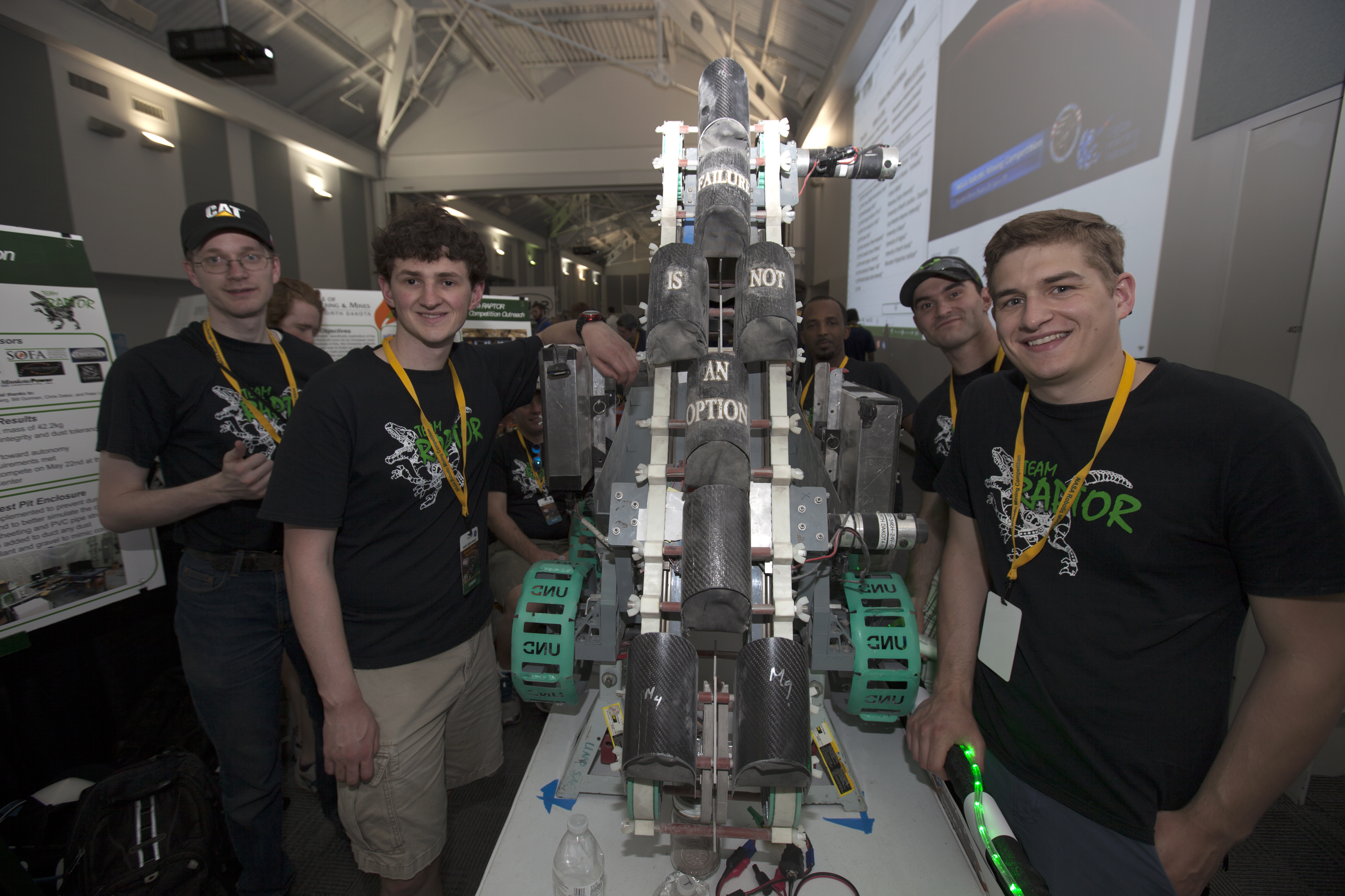 Team Raptor members from the University of North Dakota College of Engineering and Mines check their robot, named "Marsbot," in the RoboPit at NASA's 8th Annual Robotic Mining Competition at the Kennedy Space Center Visitor Complex in Florida. More than 40 student teams from colleges and universities around the U.S. will use their uniquely-designed mining robots to dig in a supersized sandbox filled with BP-1, or simulated Martian soil, and participate in other competition requirements. The Robotic Mining Competition is a NASA Human Exploration and Operations Mission Directorate project designed to encourage students in science, technology, engineering and math, or STEM fields. The project provides a competitive environment to foster innovative ideas and solutions that could be used on NASA's Journey to Mars.