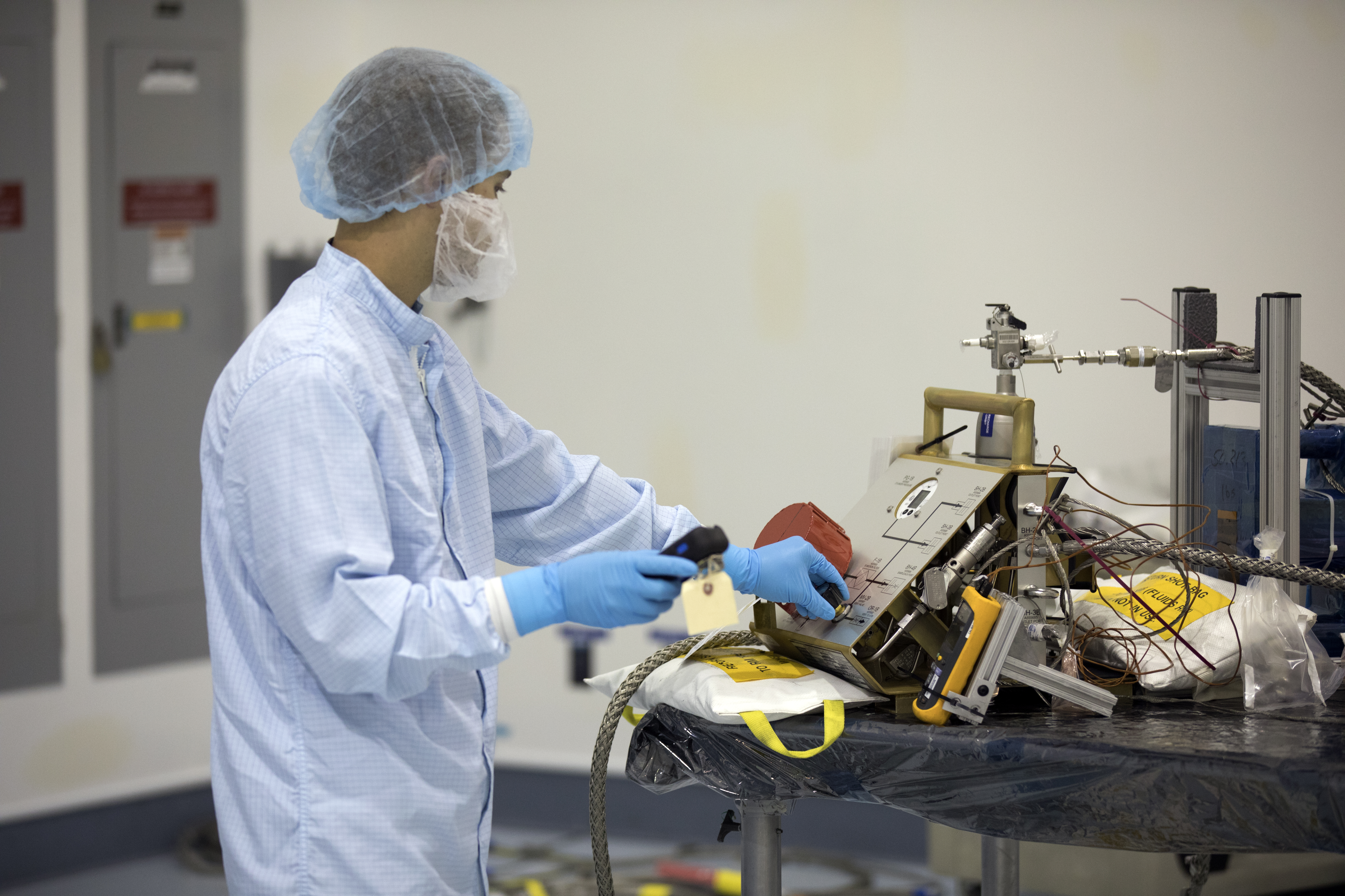 In the Space Station Processing Facility at NASA's Kennedy Space Center in Florida, Jacobs Test and Operations Support Contract, or TOSC, technician John Thompson helps fill portable breathing apparatuses, or PBAS. The PBAs are to be use on board the International Space Staton to provide astronauts with breathable air in the event of a fire or other emergency situation.