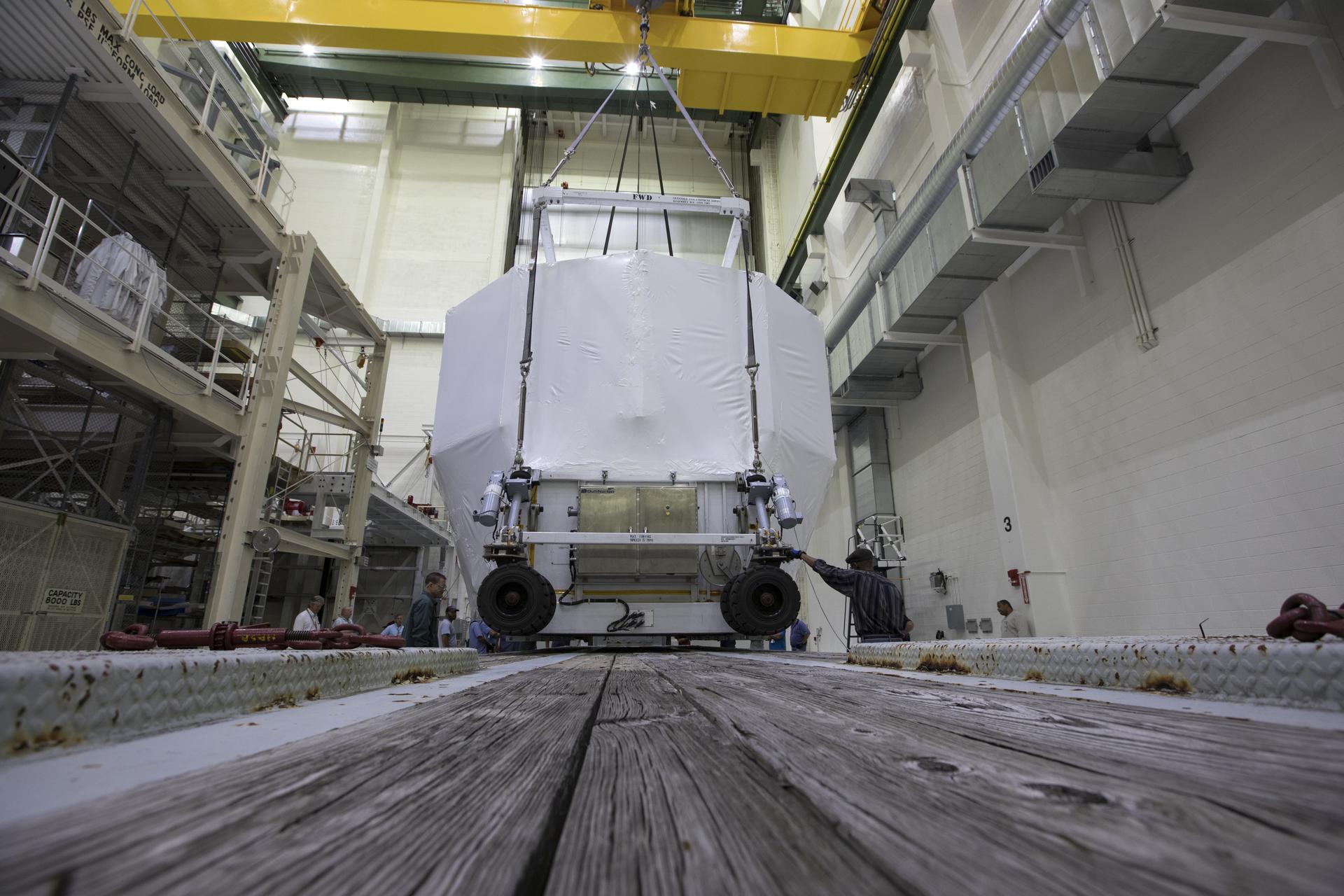 The Orion service module structural test article for Exploration Mission-1 (EM-1), built by the European Space Agency, is prepared for shipment to Lockheed Martin's Denver facility to undergo testing. Inside the Neil Armstrong Operations and Checkout Building high bay at NASA's Kennedy Space Center in Florida, a crane lifts the module, secured on a stand, for the move to the transport truck. The Orion spacecraft will launch atop the agency's Space Launch System rocket on EM-1 in 2019.