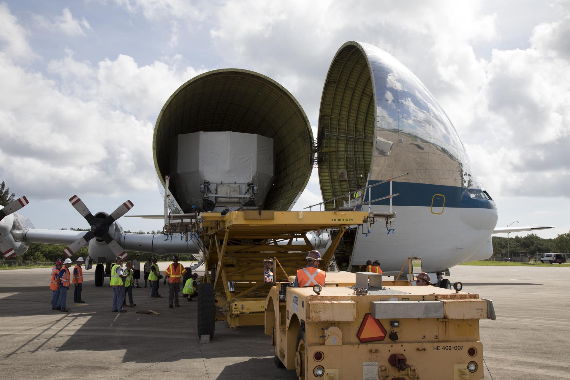 The Orion service module structural test article for Exploration Mission-1 (EM-1), built by the European Space Agency, is moved inside NASA's Super Guppy aircraft at Kennedy Space Center's Shuttle Landing Facility, managed by Space Florida. The module will be secured inside the aircraft and shipped to Lockheed Martin's Denver facility to undergo testing. The Orion spacecraft will launch atop the agency's Space Launch System rocket on EM-1 in 2019.
