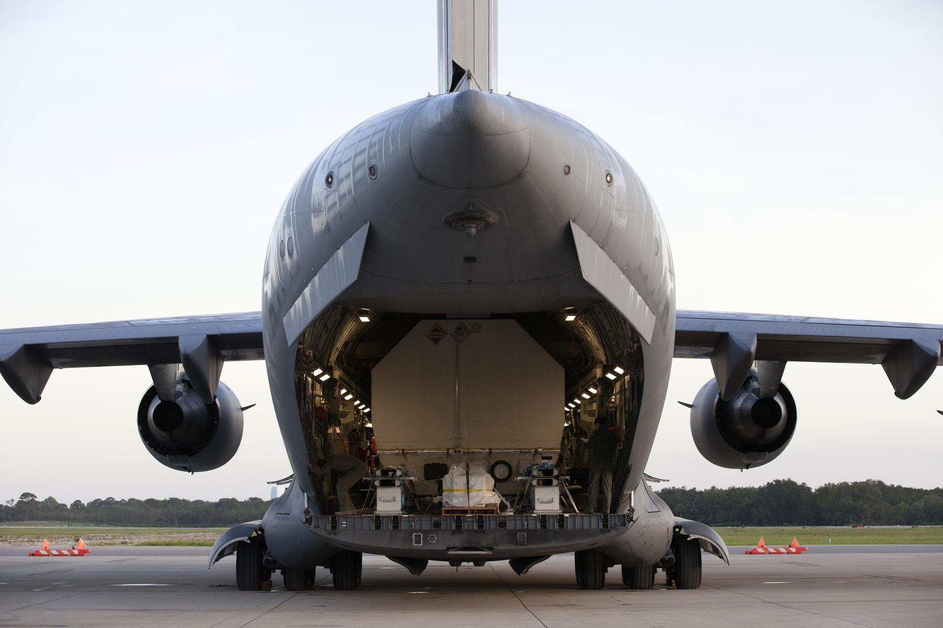 NASA's TDRS-M satellite arrives inside its shipping container at Space Coast Regional Airport in Titusville, Florida, aboard a U.S. Air Force transport aircraft. The spacecraft will be transported to the nearby Astrotech facility, also in Titusville, for preflight processing. The TDRS-M is the latest spacecraft destined for the agency's constellation of communications satellites that allows nearly continuous contact with orbiting spacecraft ranging from the International Space Station and Hubble Space Telescope to the array of scientific observatories. Liftoff atop a United Launch Alliance Atlas V rocket is scheduled to take place from Space Launch Complex 41 at Cape Canaveral Air Force Station at 9:02 a.m. EDT Aug. 3, 2017.