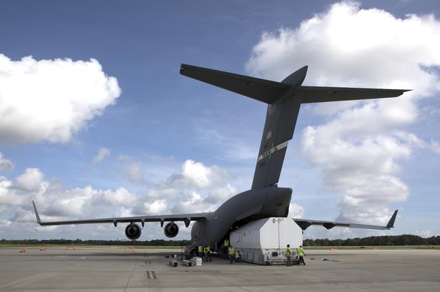 NASA's TDRS-M satellite arrives inside its shipping container at Space Coast Regional Airport in Titusville, Florida, aboard a U.S. Air Force transport aircraft. The spacecraft will be transported to the nearby Astrotech facility, also in Titusville, for preflight processing. The TDRS-M is the latest spacecraft destined for the agency's constellation of communications satellites that allows nearly continuous contact with orbiting spacecraft ranging from the International Space Station and Hubble Space Telescope to the array of scientific observatories. Liftoff atop a United Launch Alliance Atlas V rocket is scheduled to take place from Space Launch Complex 41 at Cape Canaveral Air Force Station at 9:02 a.m. EDT Aug. 3, 2017.