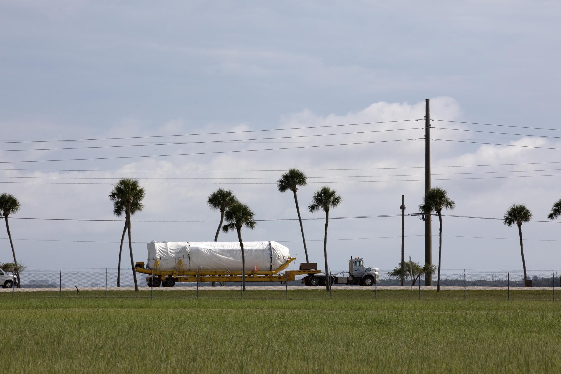 A United Launch Alliance Centaur uppoer stage is transported to the Atlas Spaceflight Operations Center at Cape Canaveral Air Force Station in Florida. The rocket is scheduled to launch the Tracking and Data Relay Satellite, TDRS-M. It will be the latest spacecraft destined for the agency's constellation of communications satellites that allows nearly continuous contact with orbiting spacecraft ranging from the International Space Station and Hubble Space Telescope to the array of scientific observatories. Liftoff atop the ULA Atlas V rocket is scheduled to take place from Cape Canaveral's Space Launch Complex 41 on Aug. 3, 2017 at 9:02 a.m. EDT.