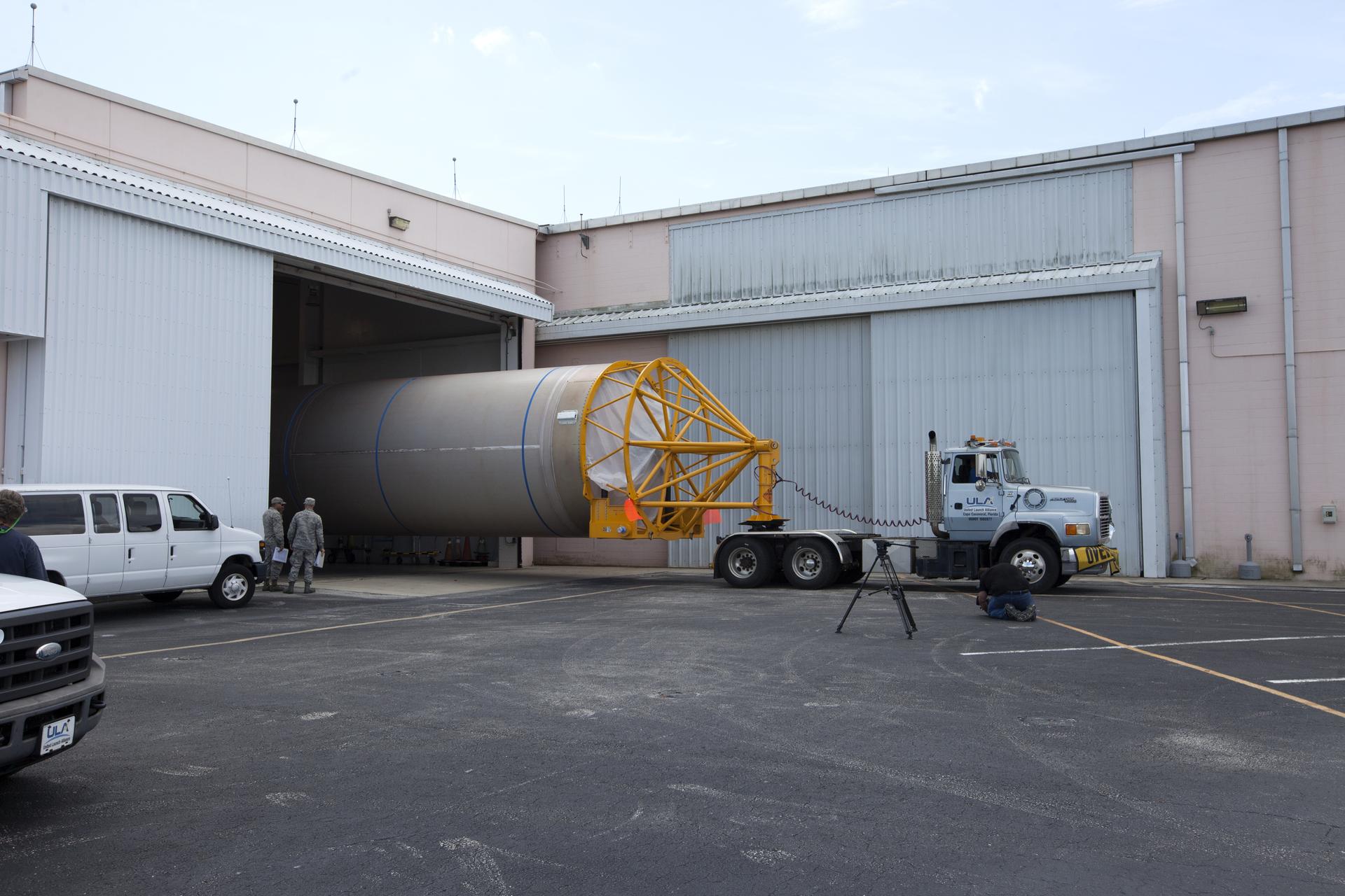 A United Launch Alliance Atlas V rocket booster arrives at the Atlas Spaceflight Operations Center at Cape Canaveral Air Force Station in Florida. The rocket is scheduled to launch the Tracking and Data Relay Satellite, TDRS-M. It will be the latest spacecraft destined for the agency's constellation of communications satellites that allows nearly continuous contact with orbiting spacecraft ranging from the International Space Station and Hubble Space Telescope to the array of scientific observatories. Liftoff atop the ULA Atlas V rocket is scheduled to take place from Cape Canaveral's Space Launch Complex 41 on Aug. 3, 2017 at 9:02 a.m. EDT.