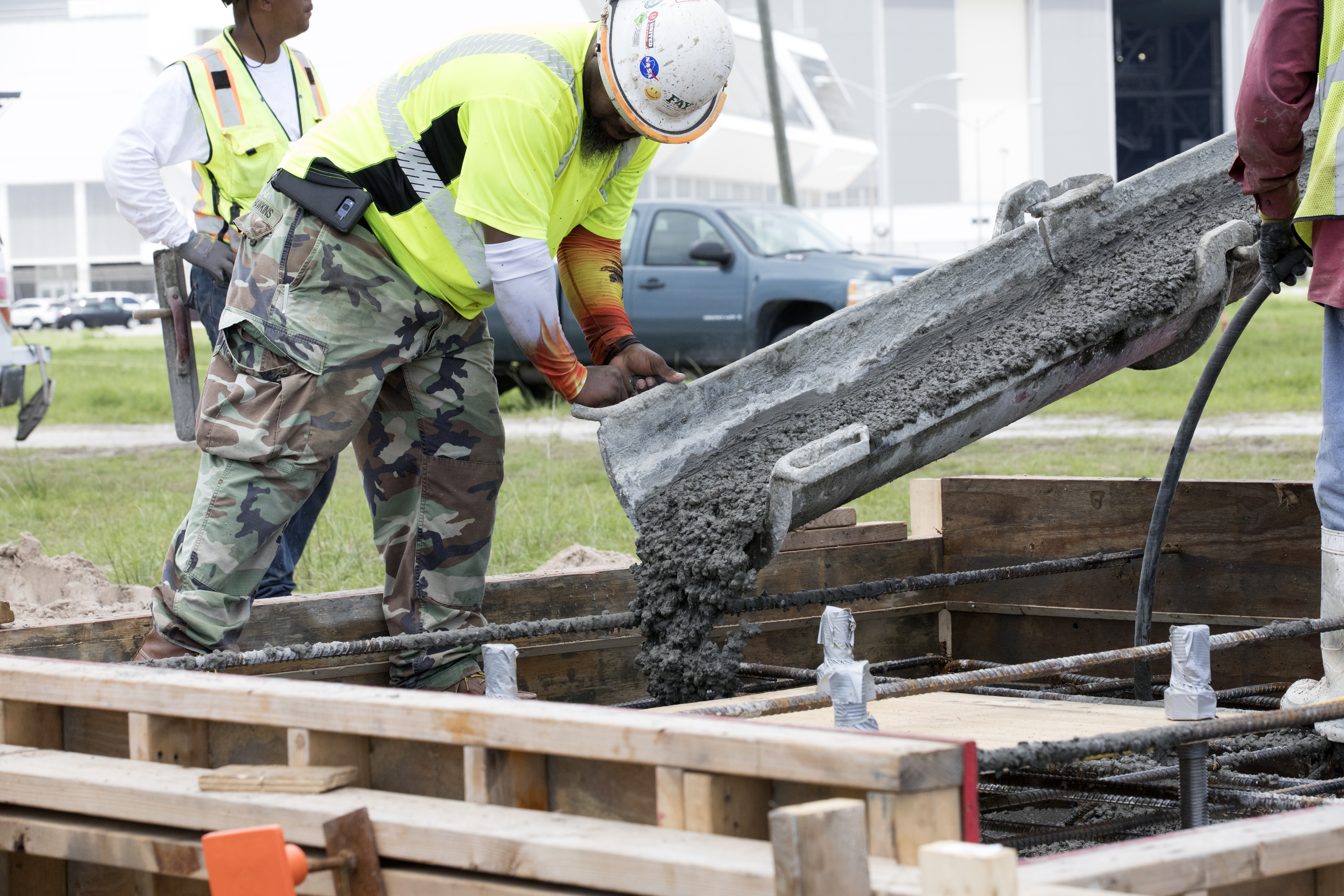 At NASA's Kennedy Space Center in Florida, cement is poured as part of a construction project to upgrade the turn basin wharf. The work includes driving multiple precast concrete piles to a depth of about 70 feet to accommodate arrival of the core stage for the agency's Space Launch System (SLS) rocket. When the stage for NASA's SLS departs the Michoud Assembly Facility in New Orleans, it will be shipped by the agency's modified barge to the Launch Complex 39 turn basin.