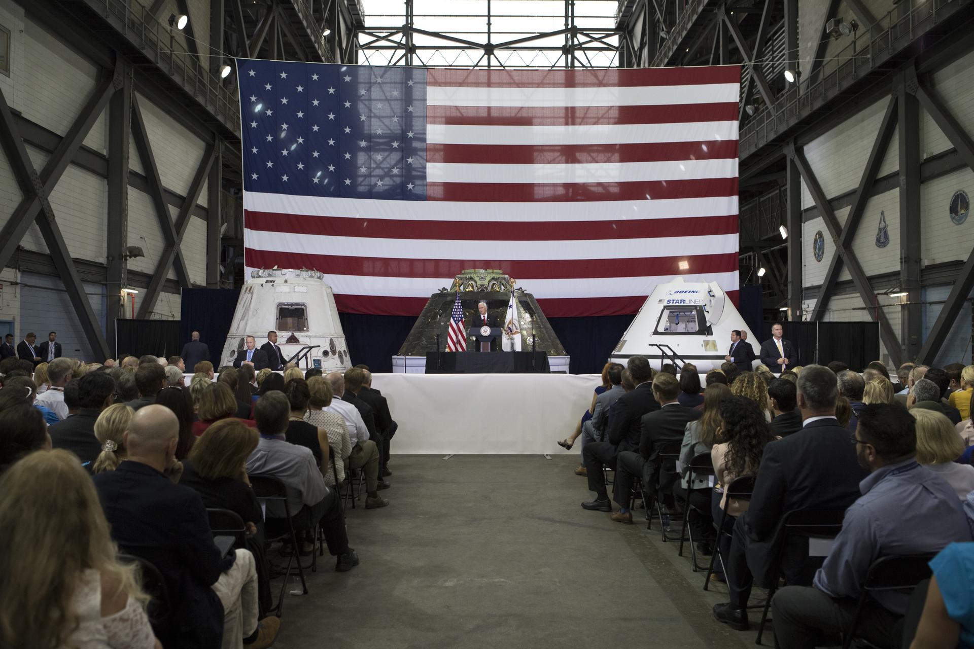 Vice President Mike Pence speaks before an audience of NASA leaders, U.S. and Florida government officials, and employees inside the Vehicle Assembly Building at NASA's Kennedy Space Center in Florida. Pence thanked employees for advancing American leadership in space. Behind the podium are, from the left, a flown SpaceX Dragon capsule, the Orion spacecraft flown on Exploration Flight test-1 in 2014, and a mockup of Boeing's CST-100 Starliner. During his visit to Kennedy, the Vice President also toured several facilities highlighting the public-private partnerships, as both NASA and commercial companies prepare to launch American astronauts from the multi-user spaceport.