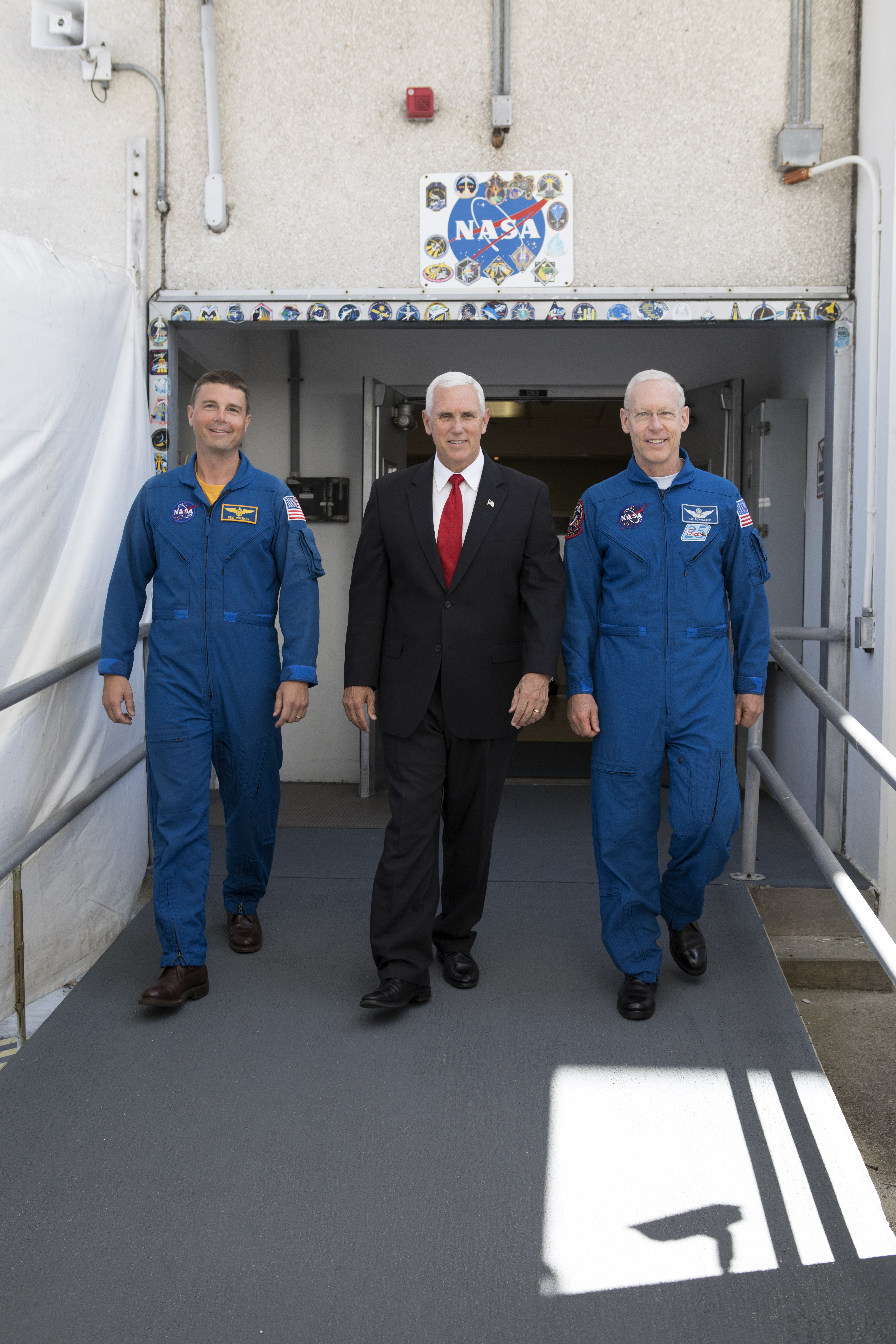 Vice President Mike Pence, center, is flanked by NASA Astronaut Reid Wiseman and NASA Astronaut Office Chief Pat Forrester as they walk out through the same door used by Apollo and space shuttle flight crews departing for the launch pad. Pence toured the Astronaut Crew Quarters during a stop at the Neil Armstrong Operations and Checkout Building at NASA's Kennedy Space Center in Florida, where the Orion spacecraft is being readied for a trip beyond the moon on its first integrated flight with the Space Launch System rocket. During his visit to Kennedy, Pence spoke inside the Vehicle Assembly Building, where he thanked employees for advancing American leadership in space. The Vice President also toured several facilities highlighting the public-private partnerships at Kennedy, as both NASA and commercial companies prepare to launch American astronauts from the multi-user spaceport.