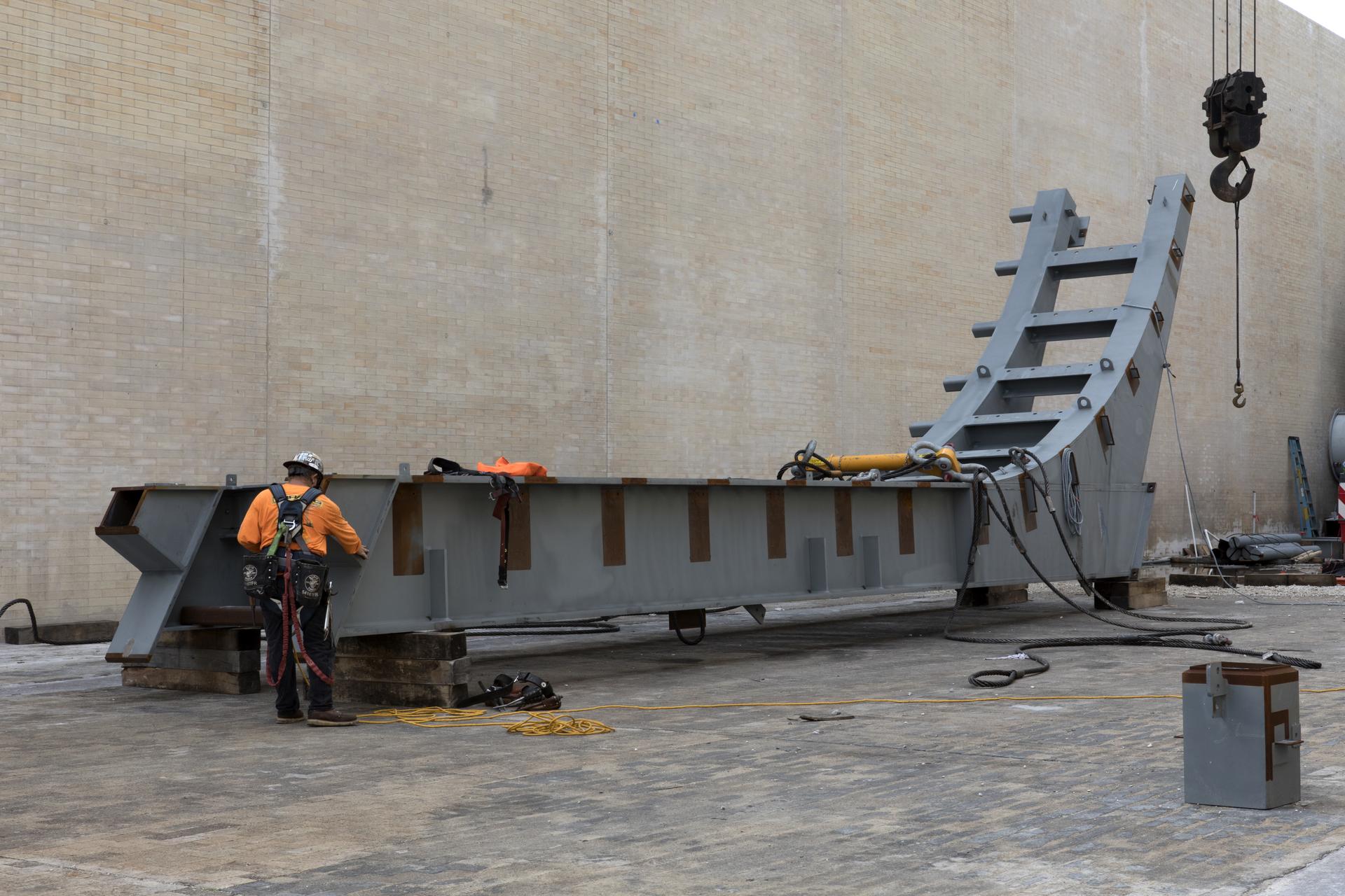 At Launch Pad 39B at NASA's Kennedy Space Center in Florida, a construction worker prepares a large segments of the support hardware for a new flame deflector to be lifted into place in the flame trench. The new flame deflector will be positioned about six feet south of the shuttle-era flame deflector’s position. During liftoff of NASA’s Space Launch System, the rocket’s flame and energy will be diverted to the north side of the flame trench. The north side of the deflector will be protected by a NASA standard coating. The south side of the deflector will not be slanted and will have no lining. The new design will provide easier access for inspection, maintenance and repair. The Ground Systems Development and Operations (GSDO) Program at Kennedy is managing the installation of the flame deflector for Exploration Mission 1, deep space missions, and NASA's Journey to Mars.