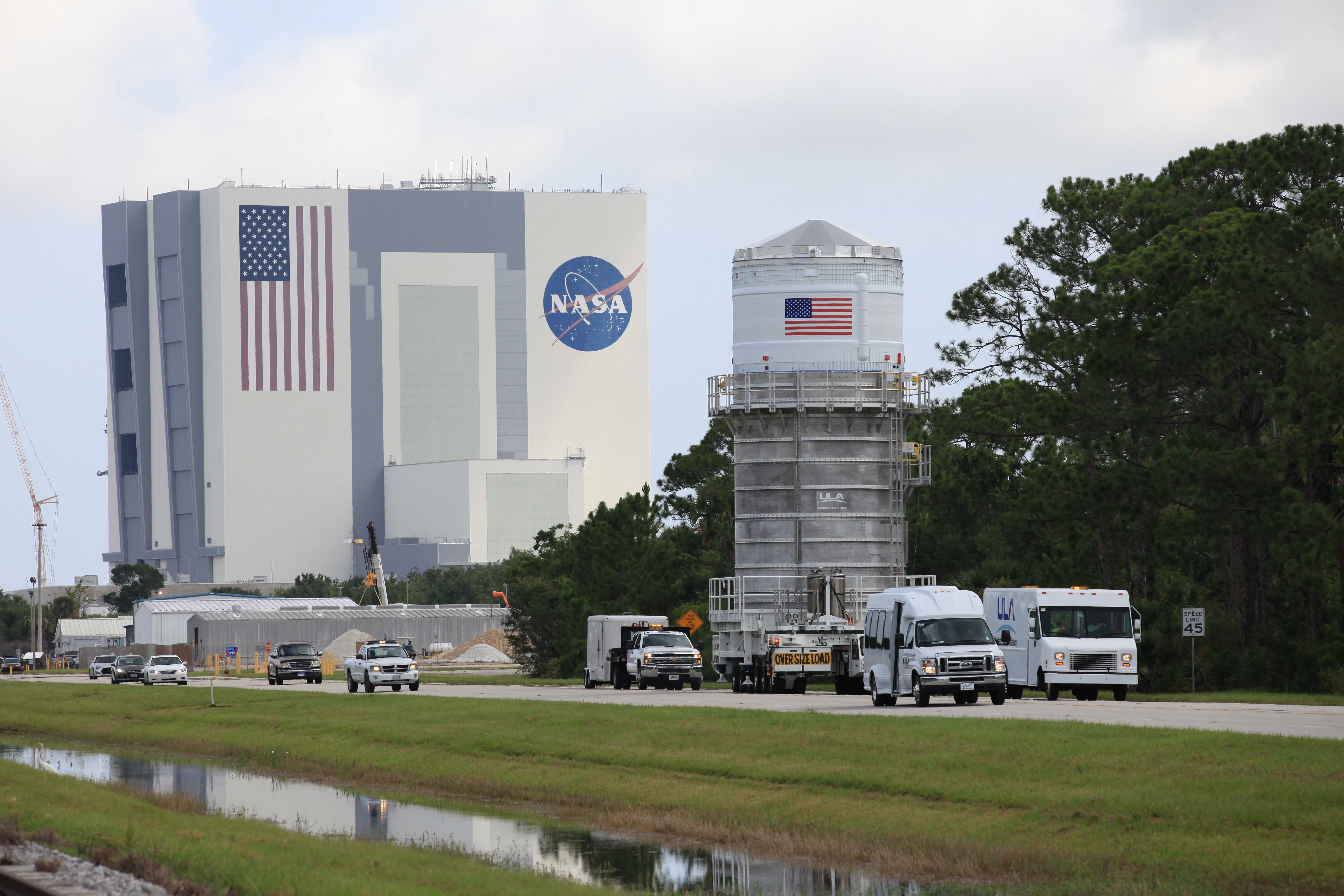 Packed inside its canister, the Interim Cryogenic Propulsion Stage (ICPS) for NASA's Space Launch System (SLS) rocket passes by the Vehicle Assembly Building on its way to the Space Station Processing Facility at NASA's Kennedy Space Center in Florida. The ICPS is the first integrated piece of flight hardware to arrive for the SLS. It is the in-space stage that is located toward the top of the rocket, between the Launch Vehicle Stage Adapter and the Orion Spacecraft Adapter. It will provide some of the in-space propulsion during Orion's first flight test atop the SLS on Exploration Mission-1.