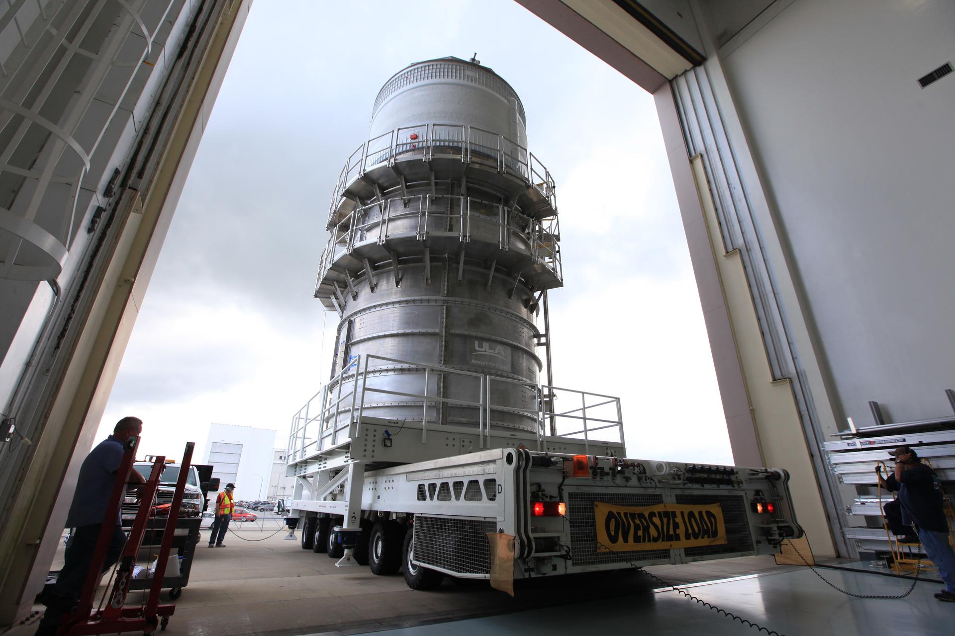 Packed inside its canister, the Interim Cryogenic Propulsion Stage (ICPS) for NASA's Space Launch System (SLS) rocket is moved into the low bay entrance of the Space Station Processing Facility at NASA's Kennedy Space Center in Florida. The ICPS is the first integrated piece of flight hardware to arrive for the SLS. It is the in-space stage that is located toward the top of the rocket, between the Launch Vehicle Stage Adapter and the Orion Spacecraft Adapter. It will provide some of the in-space propulsion during Orion's first flight test atop the SLS on Exploration Mission-1.