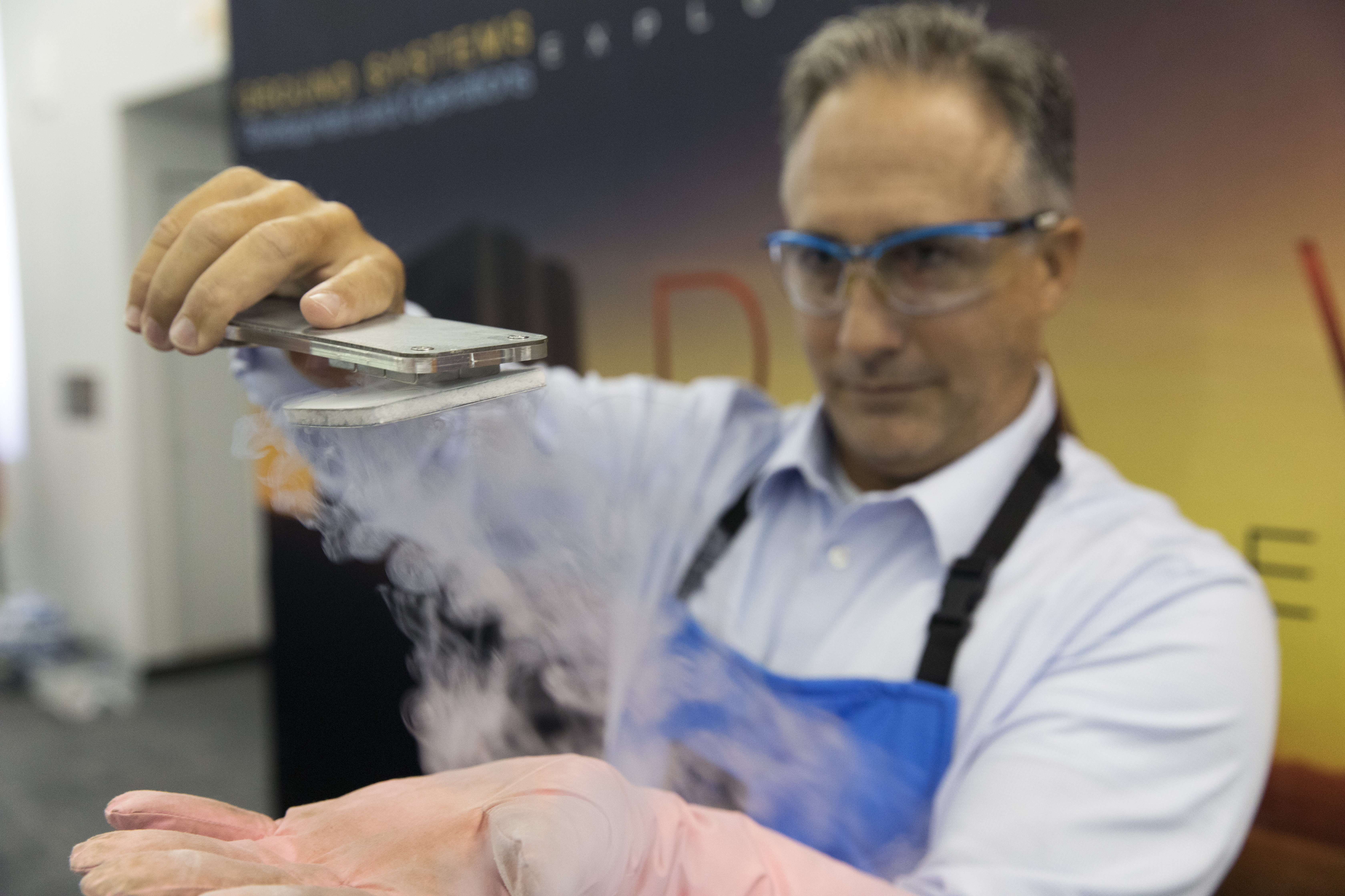 NASA Kennedy Space Center's Trent Smith conducts a quantum levitation demonstration, using liquid nitrogen, metal and a magnetic track, for students and their sponsors in the Center for Space Education at NASA’s Kennedy Space Center in Florida. Teams from across the state of Florida were gathered at Kennedy for the finals of the Zero Robotics Middle School Summer Program national championship. The five-week program allows rising sixth- through ninth-graders to write programs for small satellites called SPHERES (Synchronized, Position, Hold, Engage, Reorient, Experimental Satellites). Finalists saw their code tested aboard the International Space Station.