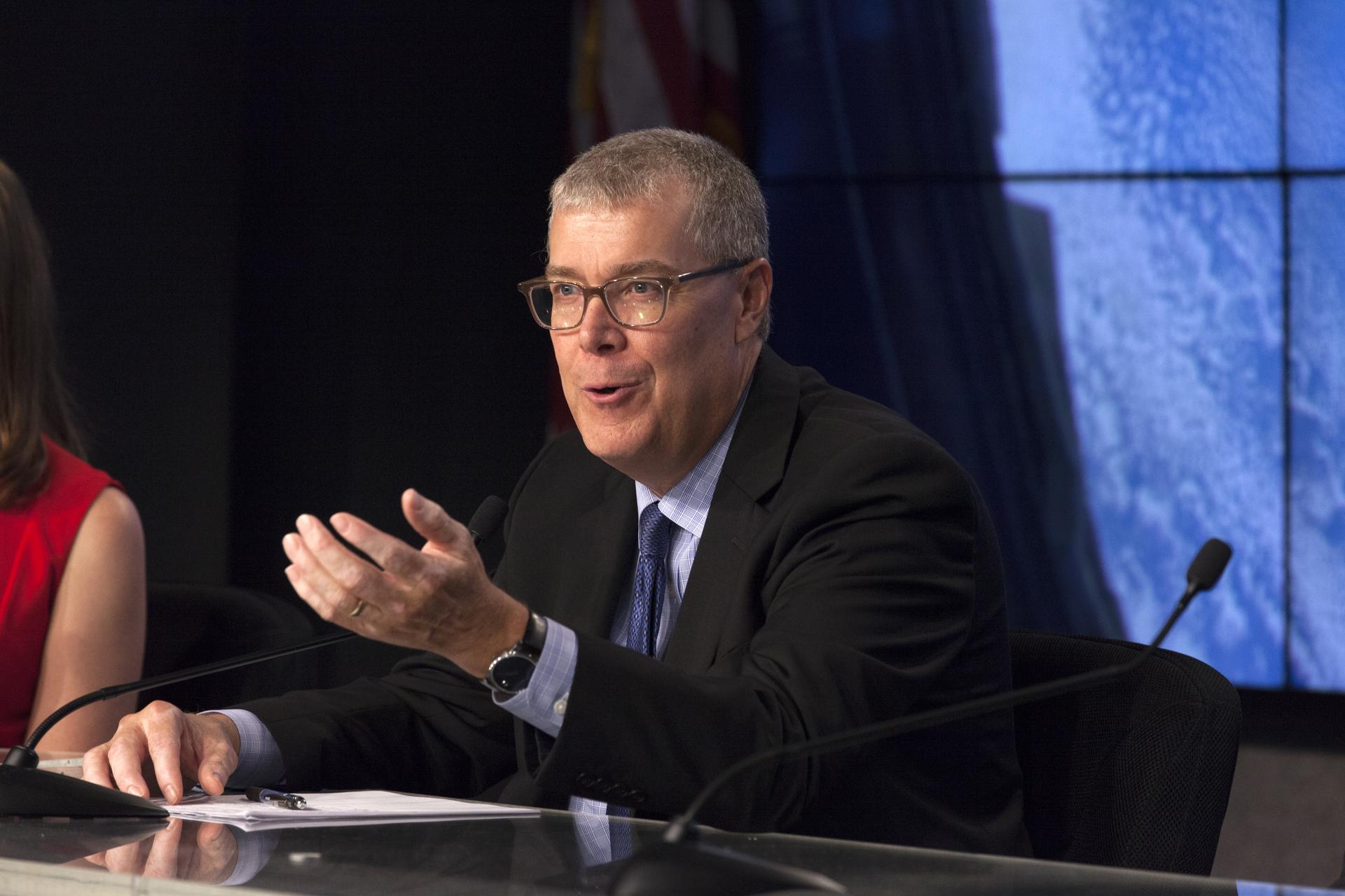 In the Press Site auditorium of NASA's Kennedy Space Center in Florida, Dan Hartman, NASA deputy manager of the International Space Station Program, speaks to media at a post-launch news conference following the liftoff of SpaceX CRS-12, a commercial resupply services mission to the International Space Station. SpaceX CRS-12 lifted off atop a Falcon 9 rocket from Kennedy's Launch Complex 39A at 12:31 p.m. EDT.