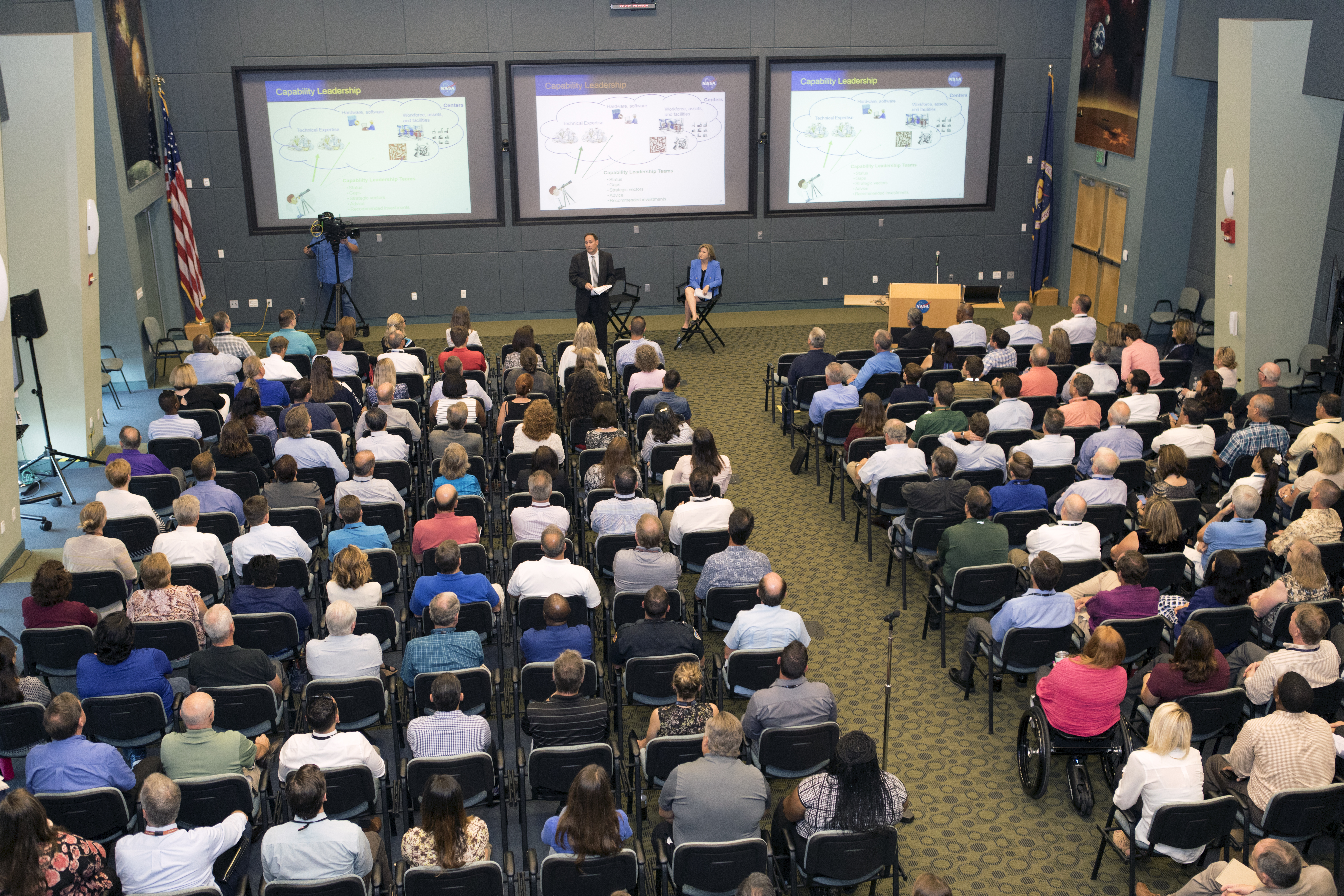 At NASA's Kennedy Space Center in Florida, agency Acting Administrator Robert Lightfoot and Deputy Associate Administrator Lesa Roe speak to employees during a town hall meeting in the conference room of Operations Support Building II. During the gathering, they updated progress on NASA programs.