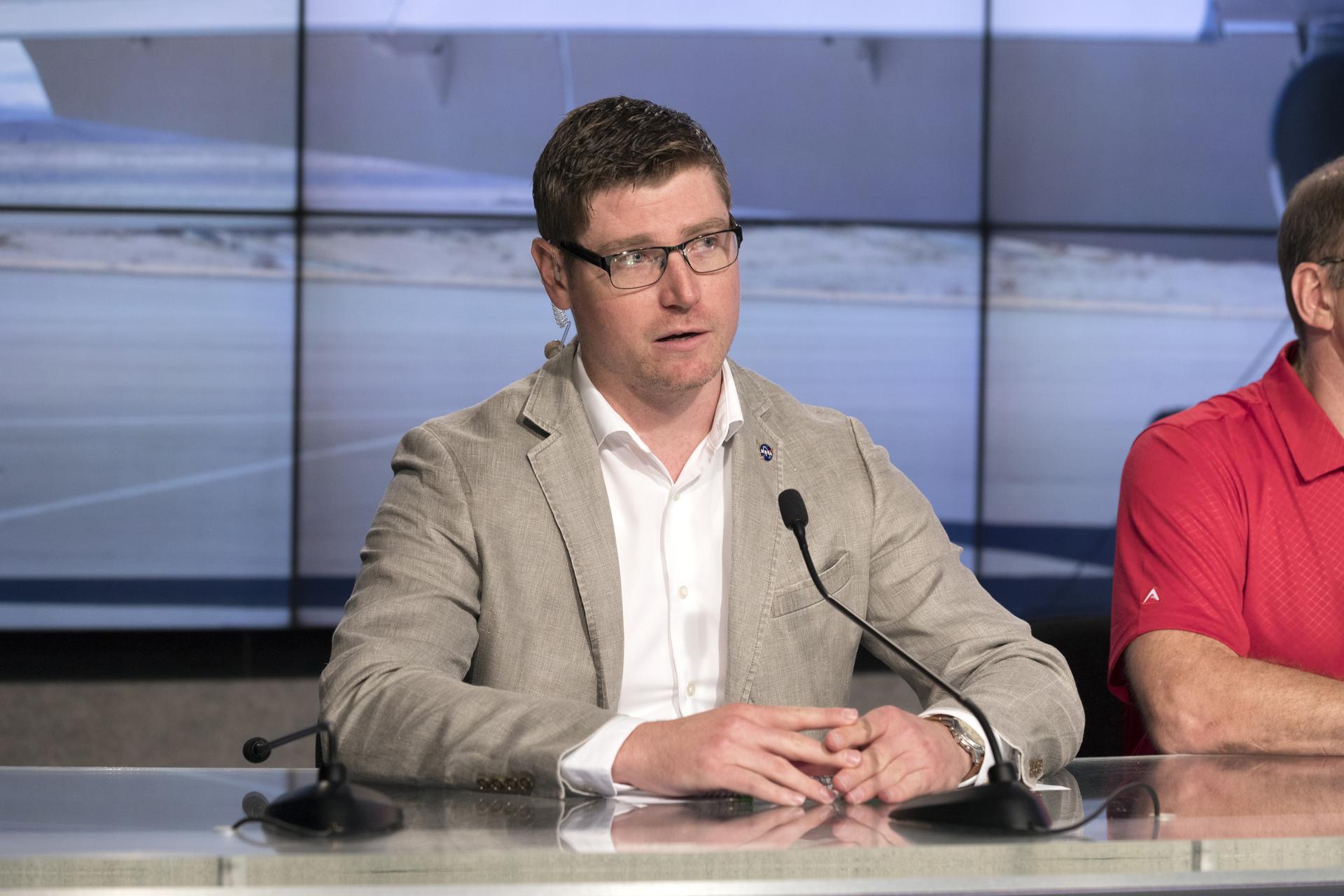 In the Kennedy Space Center's Press Site auditorium, Matthew Kamlet of NASA Communications at the Armstrong Flight Research Center in California, speaks to members of the media at a news conference to discuss upcoming flight tests to study the effects of sonic booms. Kennedy is partnering with Armstrong, Langley and Space Florida for a program called SonicBAT for Sonic Booms in Atmospheric Turbulence. Starting in August, NASA F-18 jets will take off from the Shuttle Landing Facility and fly at supersonic speeds while agency researchers on the ground measure the effects of low-altitude turbulence on sonic booms. The study could lead to technology mitigating the annoying sonic booms making possible supersonic flights over populated areas.